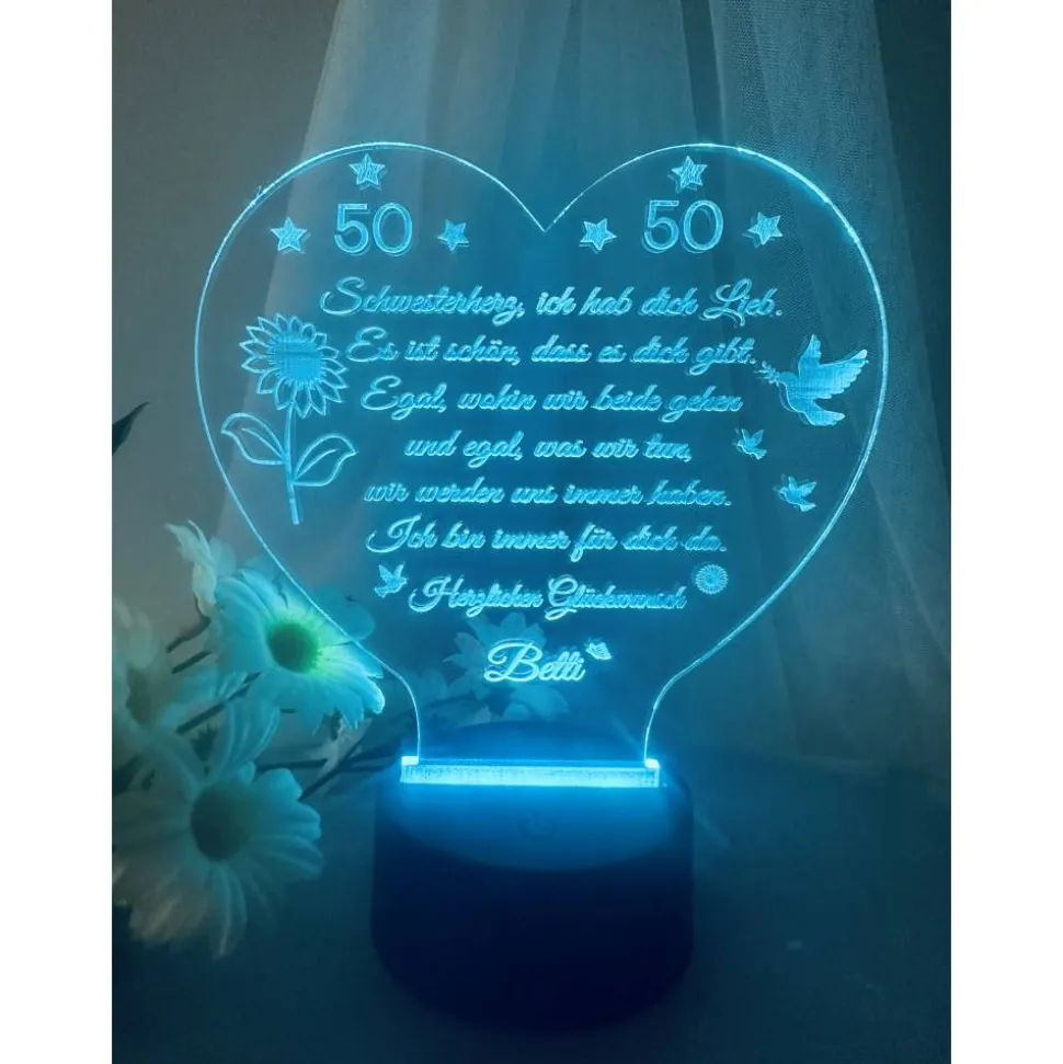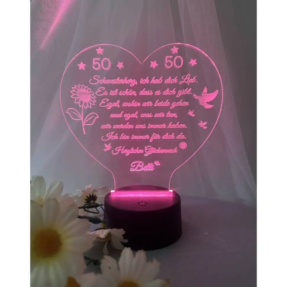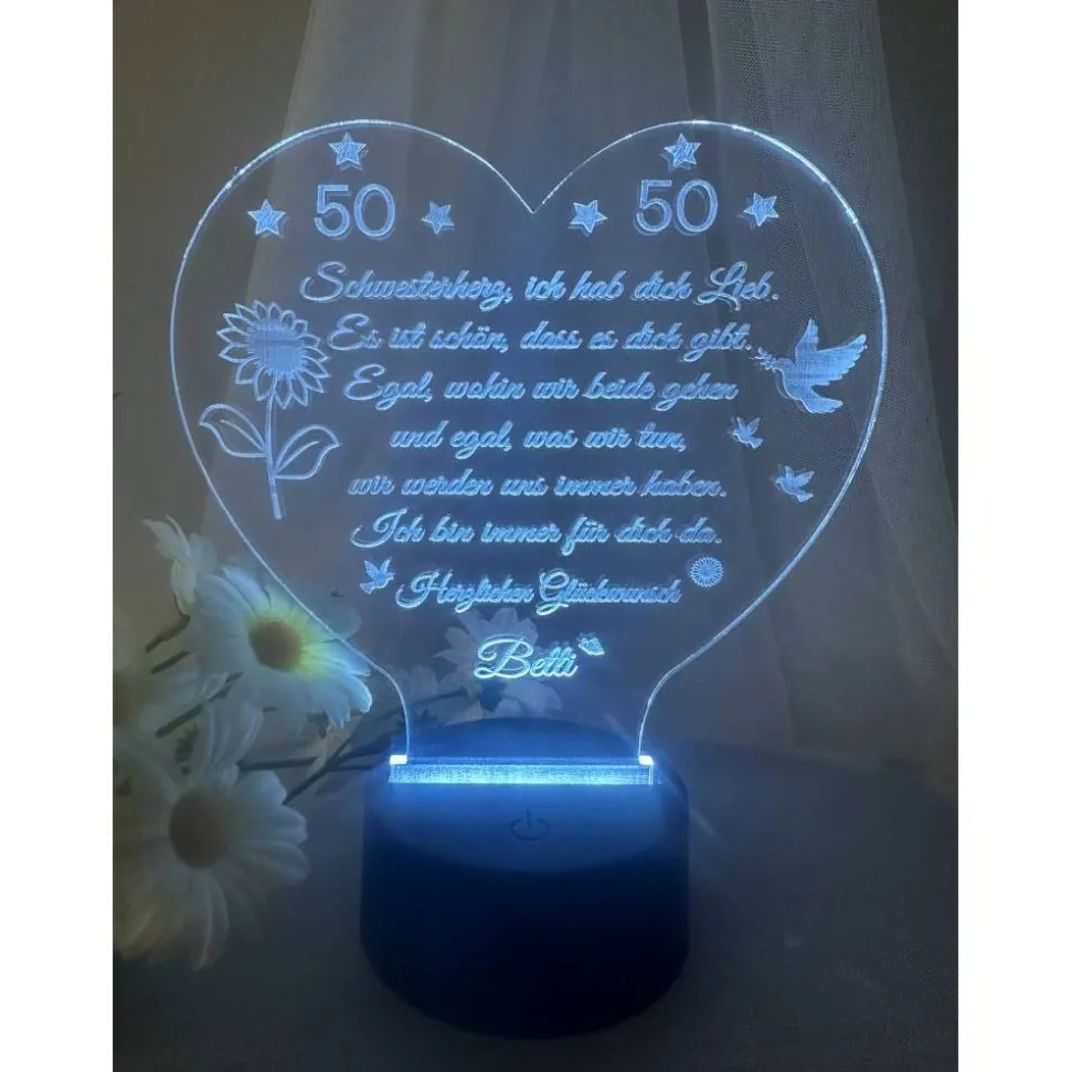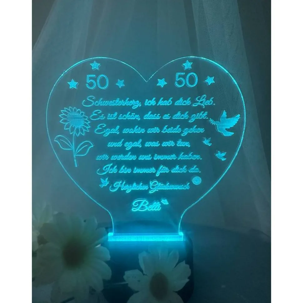 ist das perfekte Geschenk für Freunde und Familie. Die moderne 3D-Lampe wird mit einem Holz-Sockel geliefert und ist mit einer warmweißen LED-Beleuchtung ausgestattet. Sie ist aus Acryl gefertigt und kann über eine USB-Stromversorgung betrieben werden. Besonders schön ist die Gravur, die nach Wunsch mit einem individuellen Namen oder Spruch personalisiert werden kann. Die Herzlampe eignet sich für alle Zimmer und ist ein Blickfang im Wohnzimmer, Schlafzimmer oder auch im Arbeitszimmer.