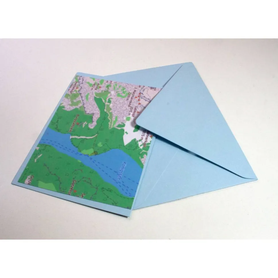 Der Umschlag auf der Rückseite ist mit einer Landschaftskulisse beklebt und dient als stilvoller Hintergrund. Hier kannst du Geld oder einen Gutschein sicher unterbringen. Zusätzlich erhältst du eine Klappkarte mit Landkartenausschnitt für persönliche Worte oder als Gutscheinträger.