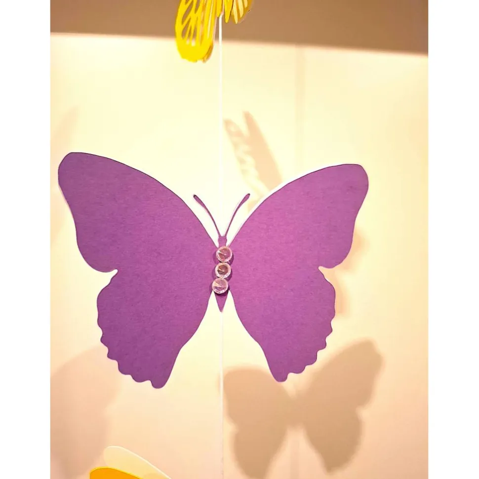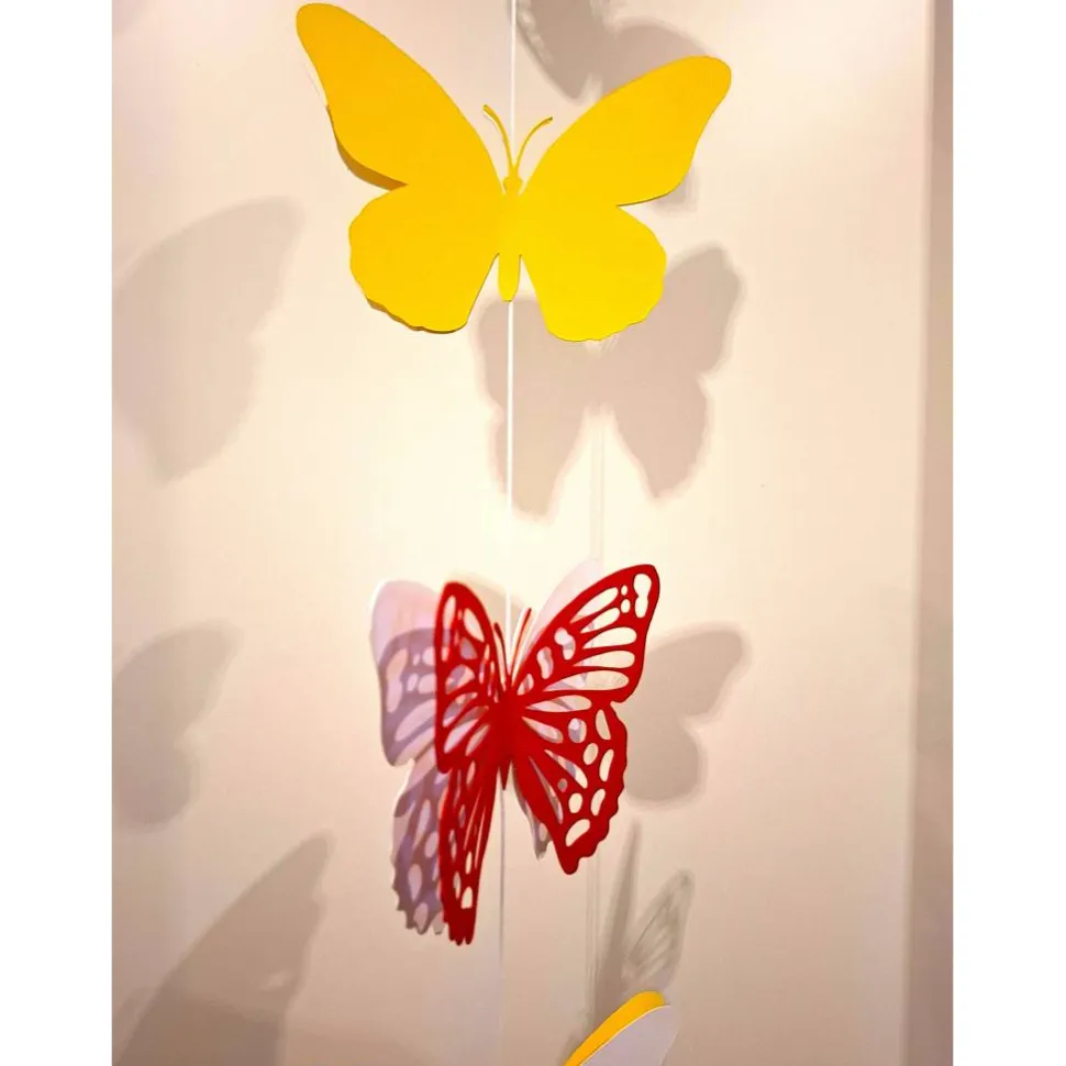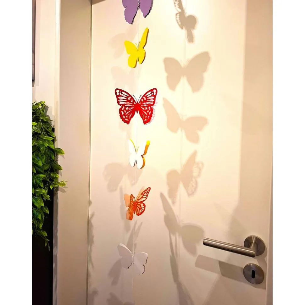 Eine Zarte, farbenfrohe Schmetterlings – Girlande, die jedem Raum sofort Leichtigkeit und Frühlingsstimmung verleiht. Die einzelnen Schmetterlinge werden aus hochwertigem 300 GSM Farbkarton gefertigt, doppellagig gearbeitet und dadurch besonders stabil und plastisch. Zwischen jedem Element verläuft ein feiner Wachsfaden , der die Schmetterlinge elegant miteinander verbindet.