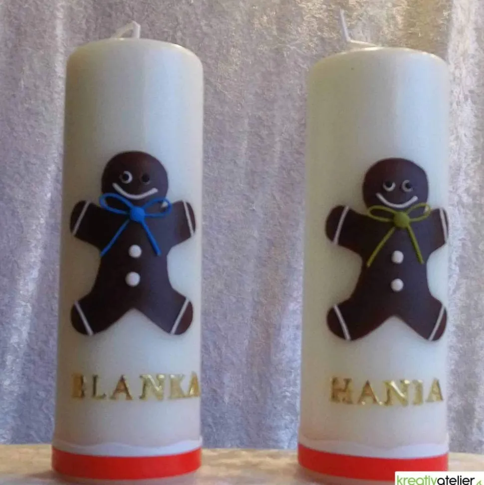 Der detailreich verzierte, braune Lebkuchenmann auf der Kerze wirkt fast zum Anbeißen lecker, während der rote Abschluss am unteren Rand von einer liebevoll aufgetragenen Schneeschicht aus weißem Wachs bedeckt ist.