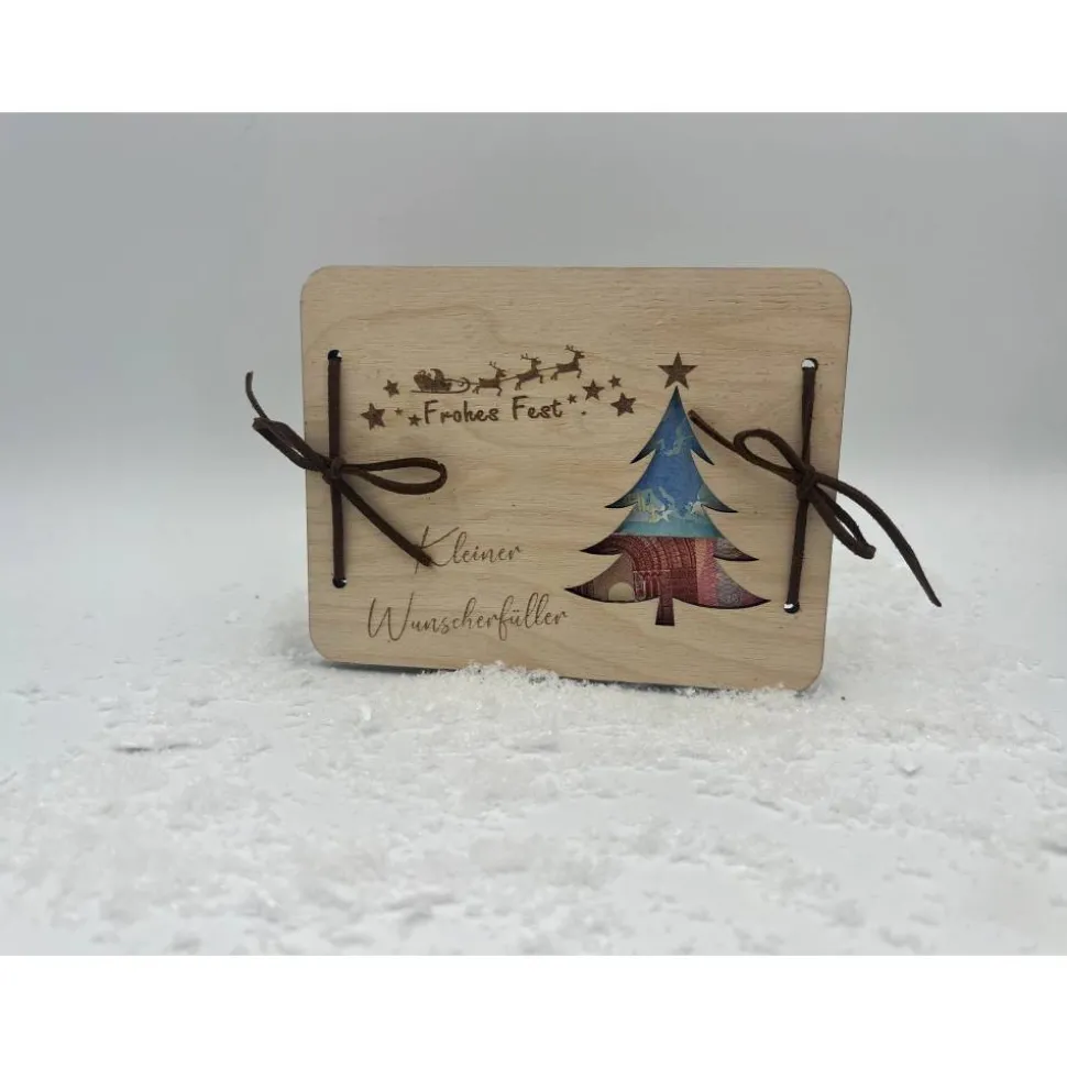 Mit dieser personalisierbaren Geschenkkarte aus Holz erhältst du das perfekte Geschenk für jeden, der Geld oder einen Gutschein von Herzen verschenken möchte. Schluss mit der langweiligen Weihnachtskarte – diese Holzkarte mit Weihnachtsmotiv sorgt für einen besonderen Auftritt unter dem Weihnachtsbaum.