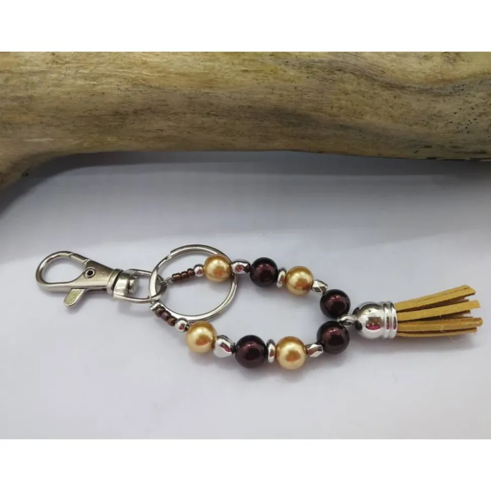Entdecke einen außergewöhnlichen Schlüssel- und Taschenanhänger in Tropfenform – handgefertigt und personalisierbar, exklusiv von derWolltiger. Dieser Schlüsselanhänger in Braun-Gold ist ein echter Blickfang und hebt sich durch seine individuelle Tropfenform sowie die liebevoll eingearbeiteten Quasten und Anhänger von der Masse ab.