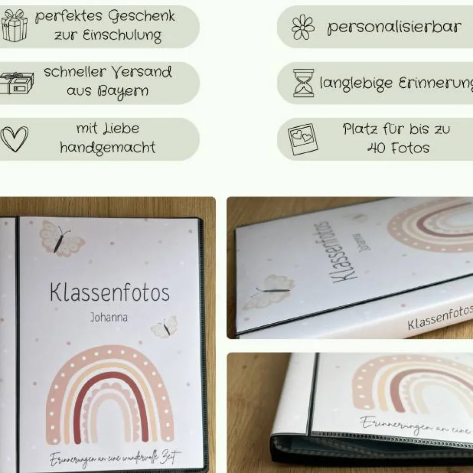 Bewahre die Klassenfotos deines Kindes sicher und stilvoll auf! Mit diesem personalisierten Fotoalbum für Klassenfotos schaffst du ein wertvolles Schulandenken, das dein Kind durch die gesamte Schulzeit begleitet. Das zeitlose Design passt zu jeder Gelegenheit und sorgt dafür, dass die Erinnerungen an Freunde und Schulzeit immer griffbereit sind.