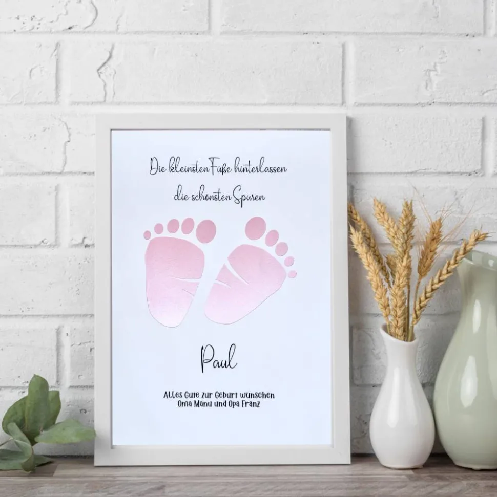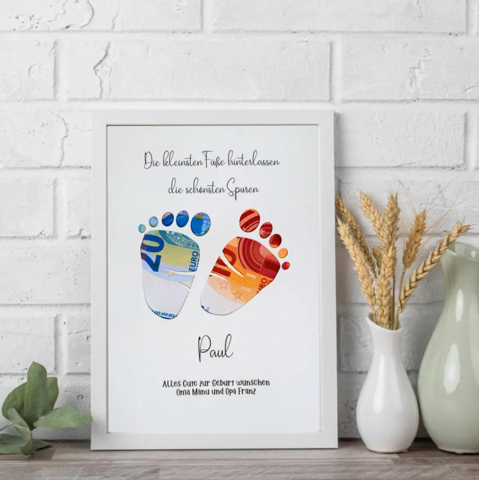 Bist du auf der Suche nach einem besonderen Geldgeschenk, das nicht nur praktisch ist, sondern auch einen bleibenden Eindruck hinterlässt? Dieses liebevoll gestaltete Geldgeschenk mit personalisierten Babyfüßen ist genau das Richtige – ein echtes Highlight für jede Feier rund ums Baby.