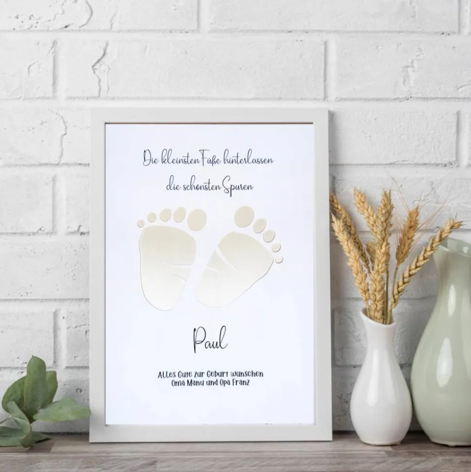 •Hochwertiges Design: A4-Bilderrahmen in Weiß mit niedlichem Babyfuß-Motiv. Die Babyfüße sind präzise aus hochwertigem Strukturpapier (246 g/m²) ausgeschnitten, sodass die Geldscheine perfekt dahinter platziert werden können.