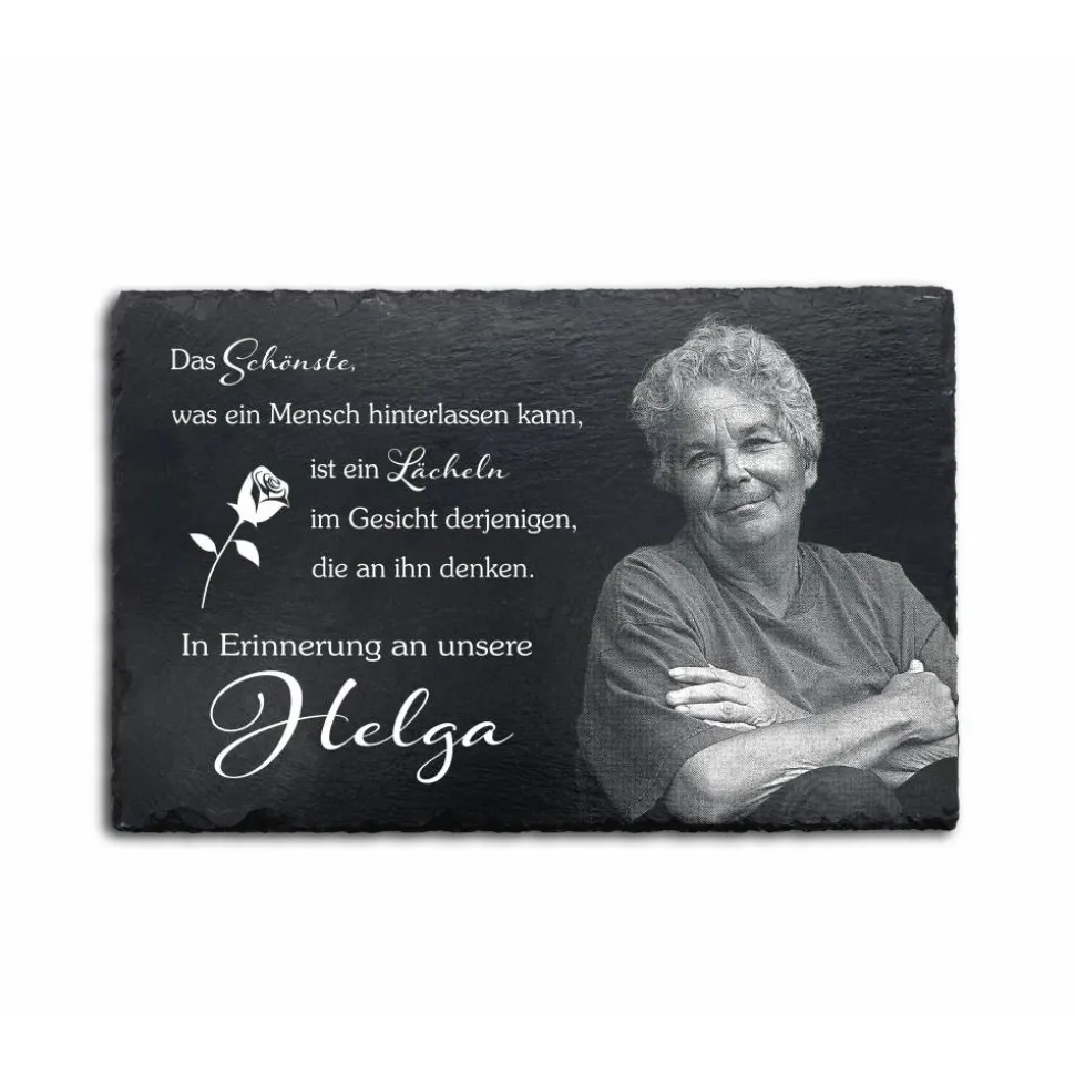 Schaffe eine bleibende Erinnerung mit einem individuellen Gedenkstein: Die 30 x 20 cm Schiefertafel inkl. Gravur ist die perfekte Wahl als persönlicher Grabschmuck. Jede Gedenktafel wird nach deinen Wünschen graviert – mit Foto, Wunschtext und auf Wunsch kleinen Symbolen. So gestaltest du eine einzigartige Grabtafel, die liebevoll an einen besonderen Menschen erinnert.