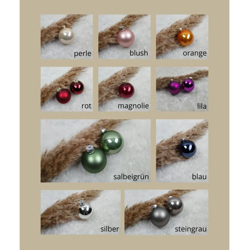 – weiß auf den Kugelfarben: rot, magnolie, lila, salbeigrün, blau und steingrau