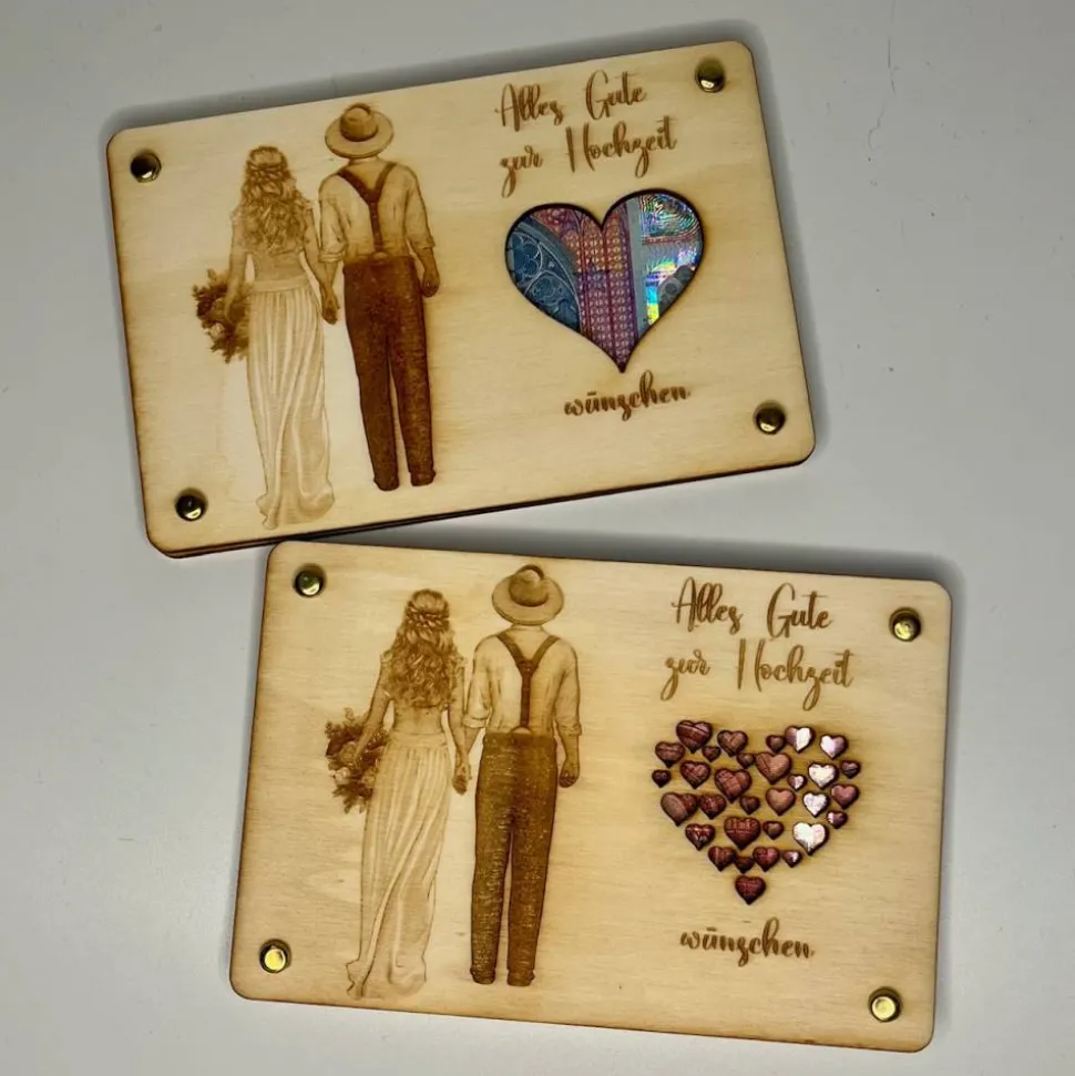 Entdecke die perfekte Geldgeschenkkarte aus hochwertigem Sperrholz, gelasert und handgefertigt – ideal zur Hochzeit!