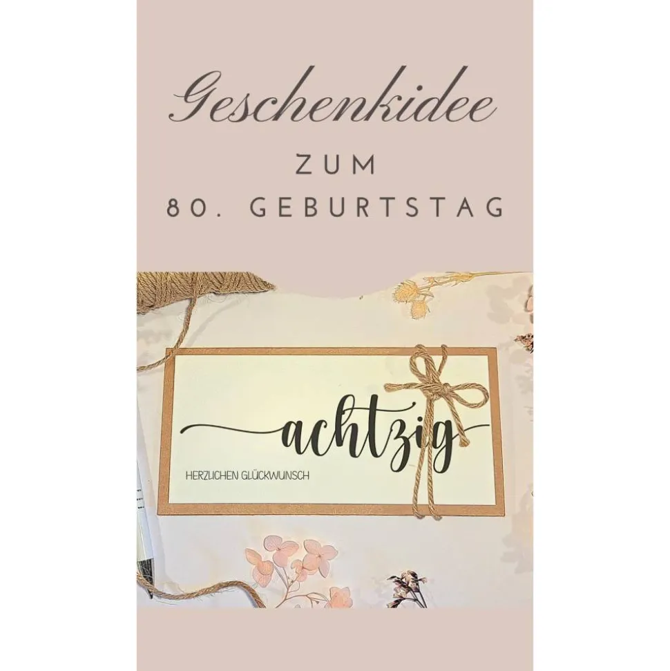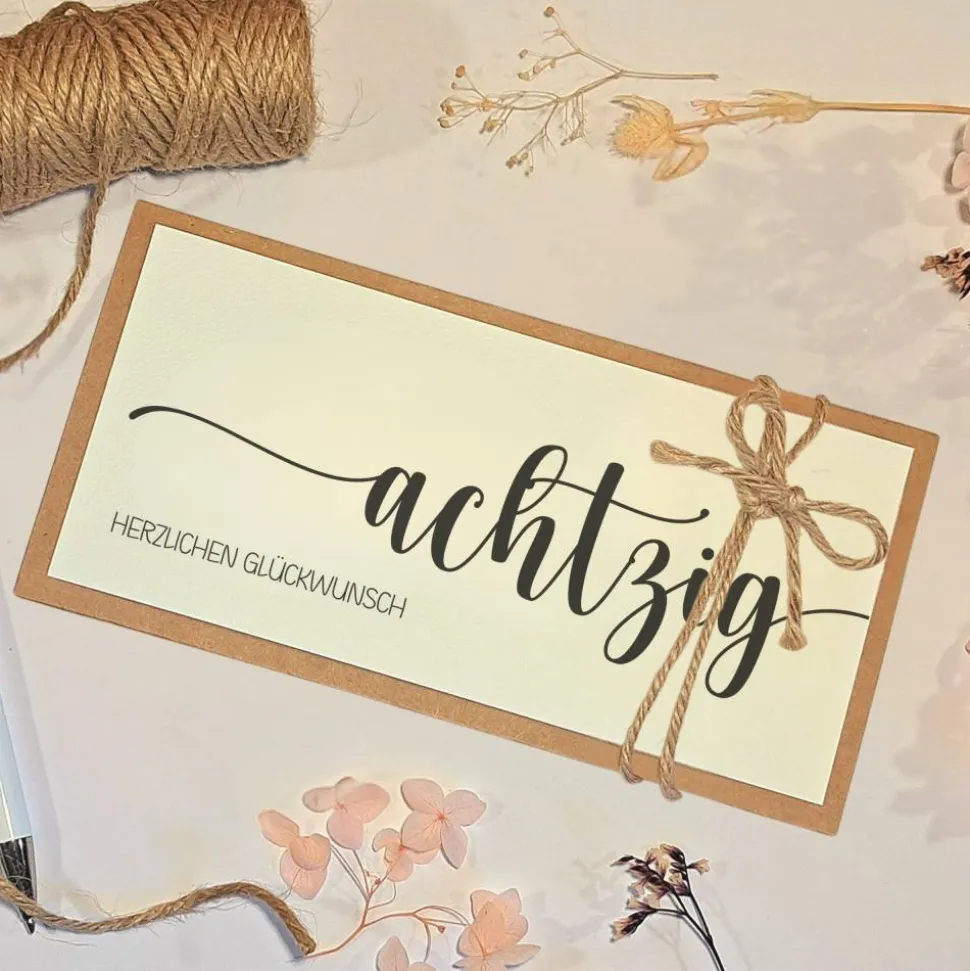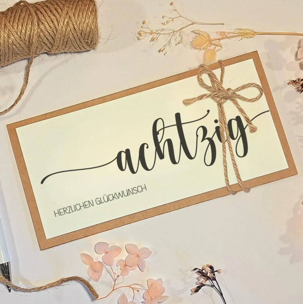 Verschenke zum 80. Geburtstag eine einzigartige und stilvolle Geldgeschenk-Karte! Diese handgemachte Geburtstagskarte eignet sich perfekt, um deine Glückwünsche und ein Geldgeschenk oder einen Gutschein besonders ansprechend zu überreichen. Das edle Design mit der Zahl „achtzig“ auf stabilem Kraftpapier und eine rustikale Juteschleife machen diese Klappkarte zu einem echten Blickfang.