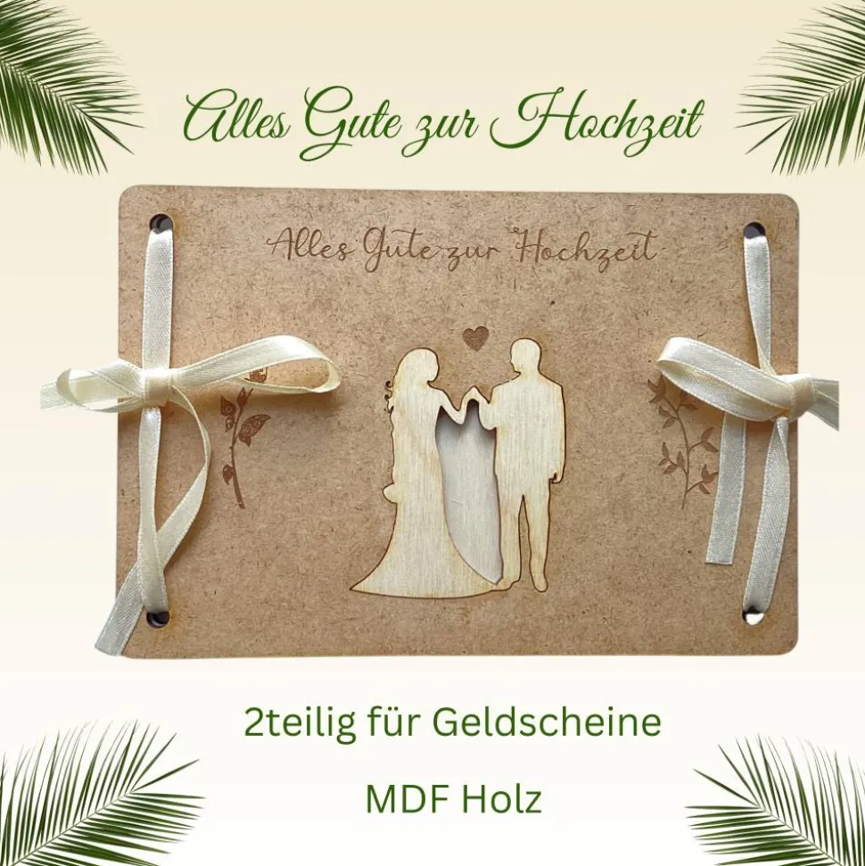 Überreiche dein Geldgeschenk zur Hochzeit auf besonders stilvolle Weise: Mit dieser personalisierten Geldgeschenkkarte aus hochwertigem Birkenholz und MDF-Holz sorgst du für einen bleibenden Eindruck beim Brautpaar. Dank Lasergravur und liebevoller Handarbeit wird jede Karte zu einem einzigartigen Unikat.