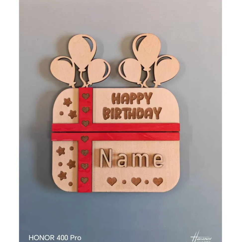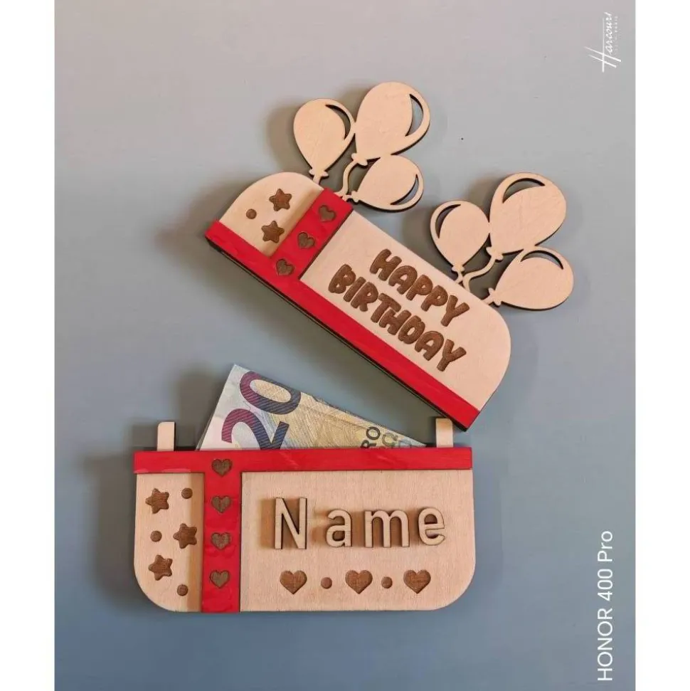 Entdecke die perfekte Geschenkidee zum Geburtstag: Mit dieser liebevoll gestalteten Geldscheinverpackung aus Holz verschenkst du Geld oder Gutscheine auf kreative und stilvolle Weise. Die hochwertige Gutscheinverpackung überzeugt durch individuelles Design und persönliche Gravur deines Wunschnamens – so wird dein Präsent garantiert zum unvergesslichen Hingucker!