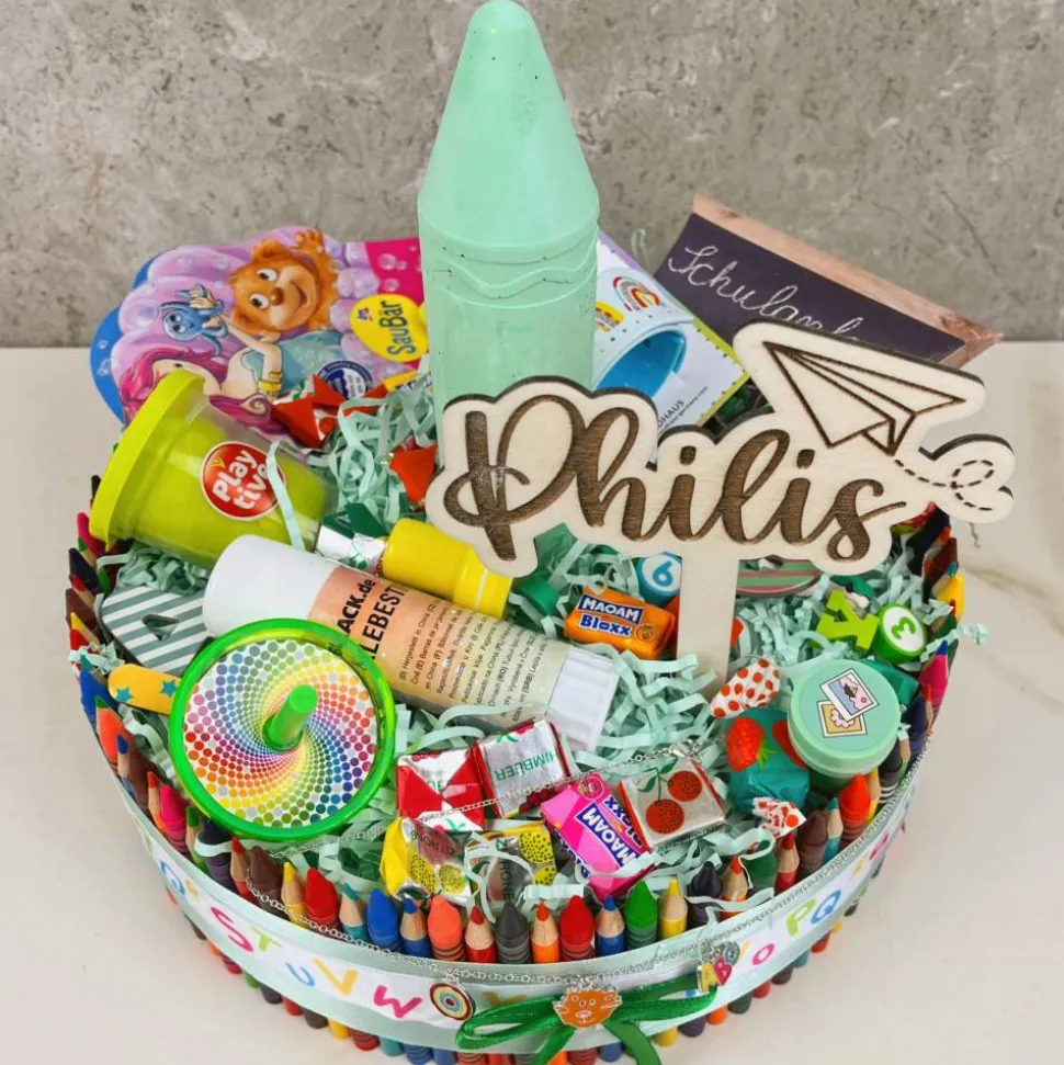 Zudem enthält jede Torte einen personalisierten Namensstecker, bitte nicht vergessen am Ende eurer Bestellung den Namen des Schulkindes einzutragen.