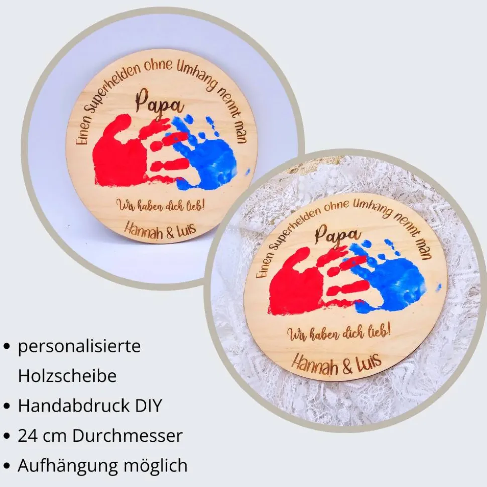 Die Holzscheibe wird euch mit dem Spruch „Ein Superheld ohne Umhang nennt man Papa“, „Wir haben dich lieb“ sowie dem Namen des Kindes / der Kinder geliefert.