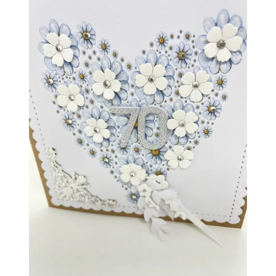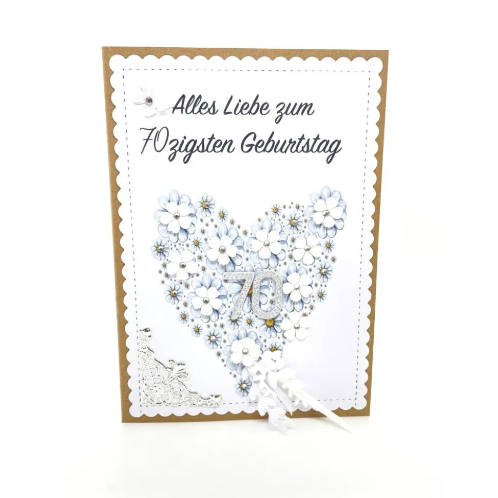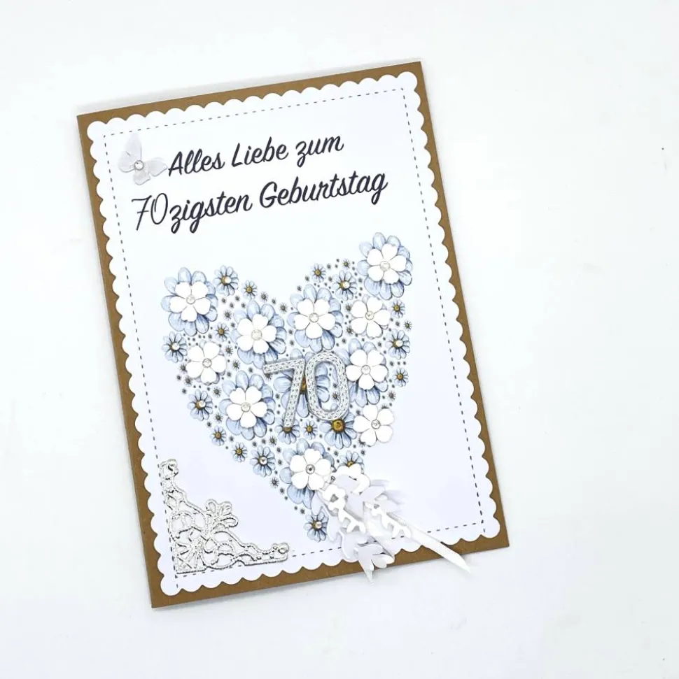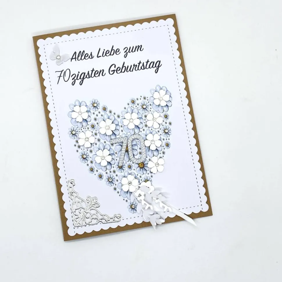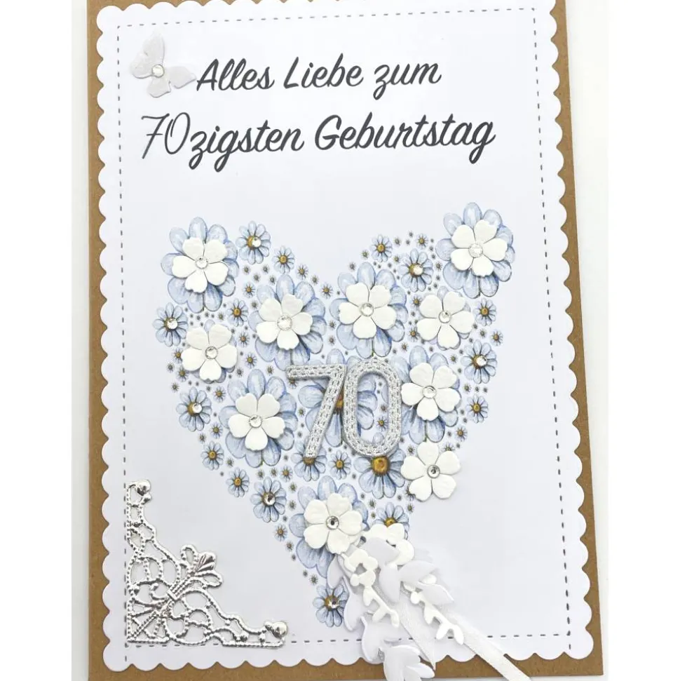 Entdecke eine einzigartige, handgefertigte Glückwunschkarte mit einem kunstvoll gestalteten Blumenherz und deiner gewünschten Zahl für einen besonderen Geburtstag oder ein Jubiläum. Jede Karte ist mit viel Liebe zum Detail gefertigt, veredelt mit einem Schleifenband, kleinen Blümchen und einem funkelnden Strassstein, der für einen edlen Glanz sorgt.