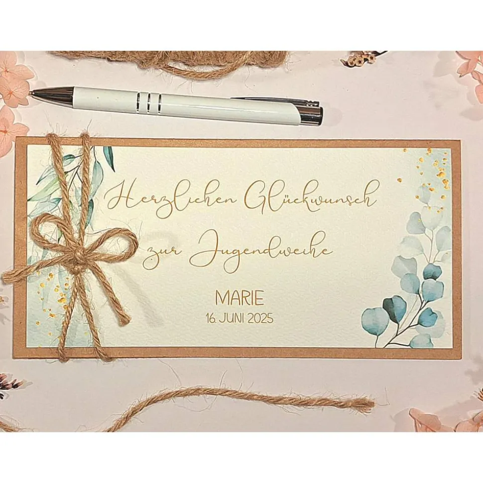 Diese personalisierte Glückwunschkarte ist die perfekte Wahl, um Geldgeschenke, Gutscheine oder Konzertkarten stilvoll zu überreichen. Die Karte wird in liebevoller Handarbeit aus hochwertigem Kraftkarton gefertigt und mit einer rustikalen Juteband-Schleife verschlossen. Das edle Aquarell-Blätter-Design macht sie zu einem einzigartigen Blickfang.