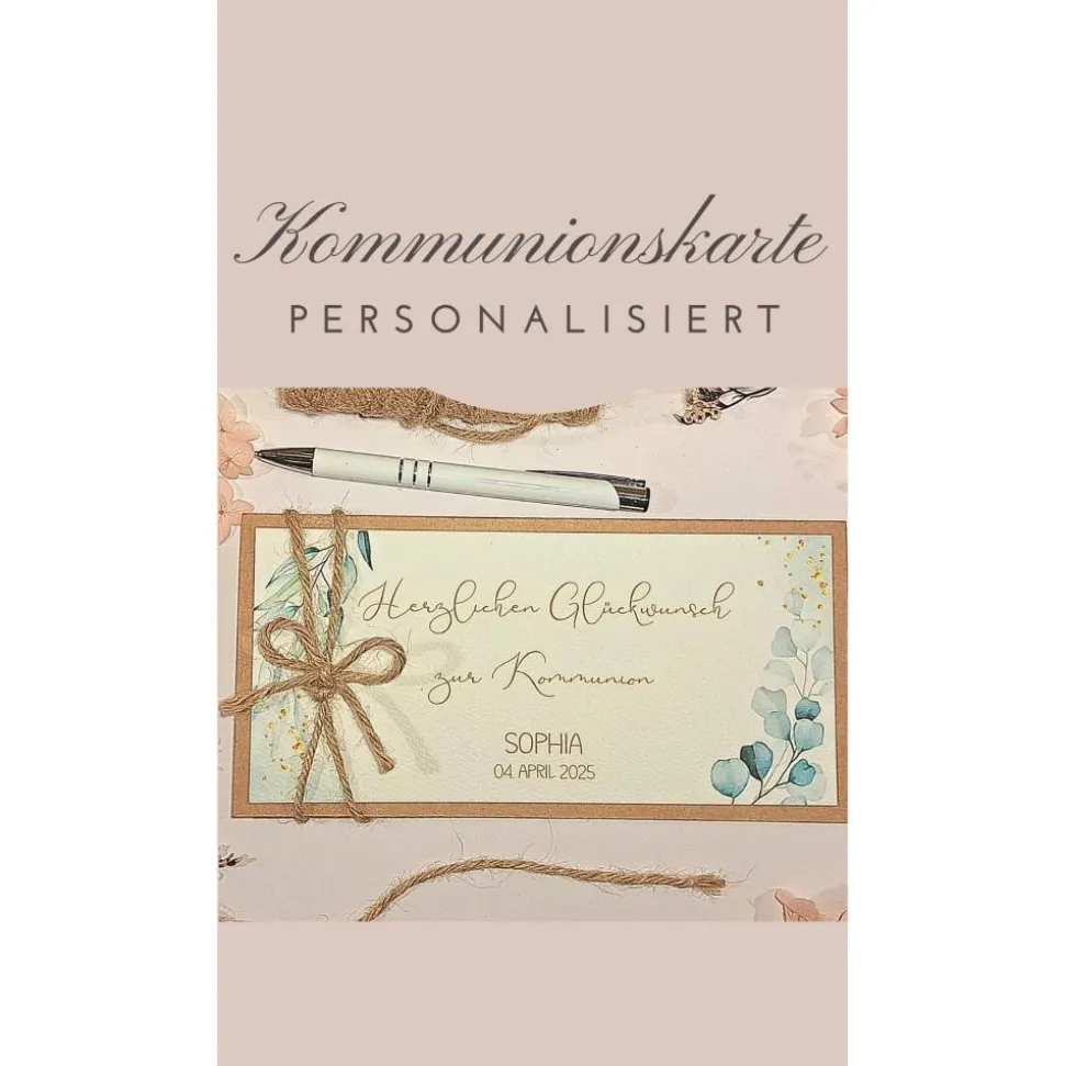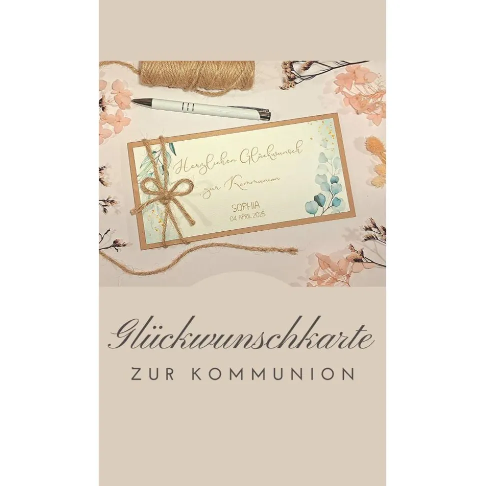 Du erhältst eine personalisierte Karte zur Kommunion inklusive weißem Umschlag. Sie ist perfekt geeignet als Geschenk von Familienmitgliedern, Freunden oder Bekannten und begleitet die Erstkommunion stilvoll und unvergesslich.