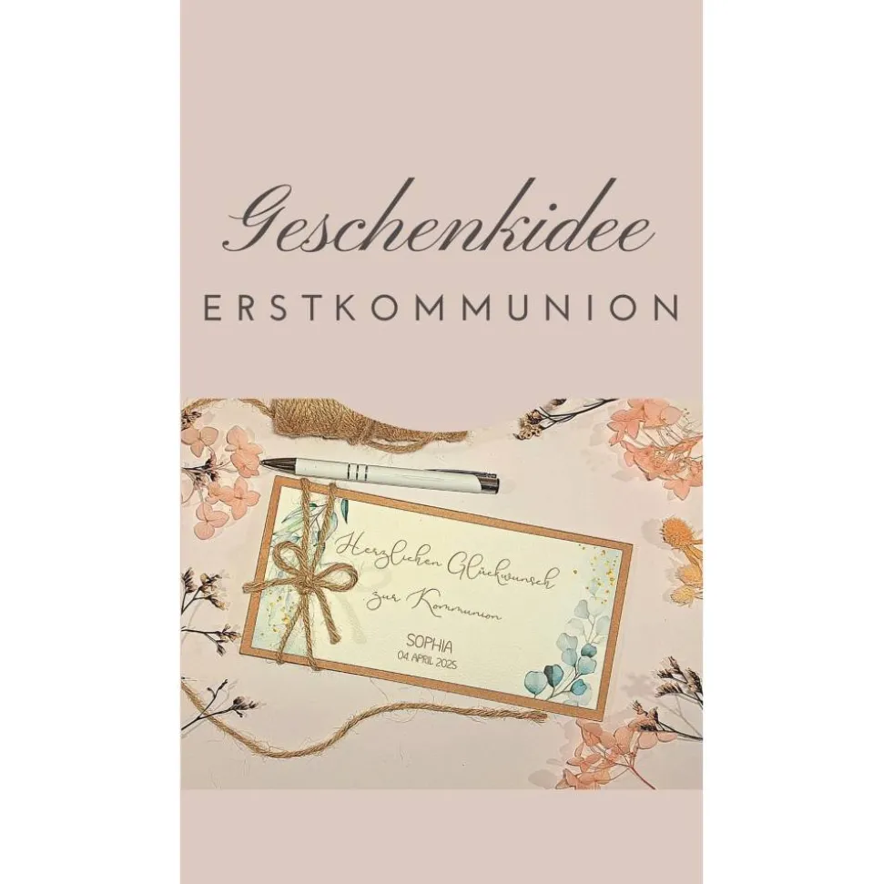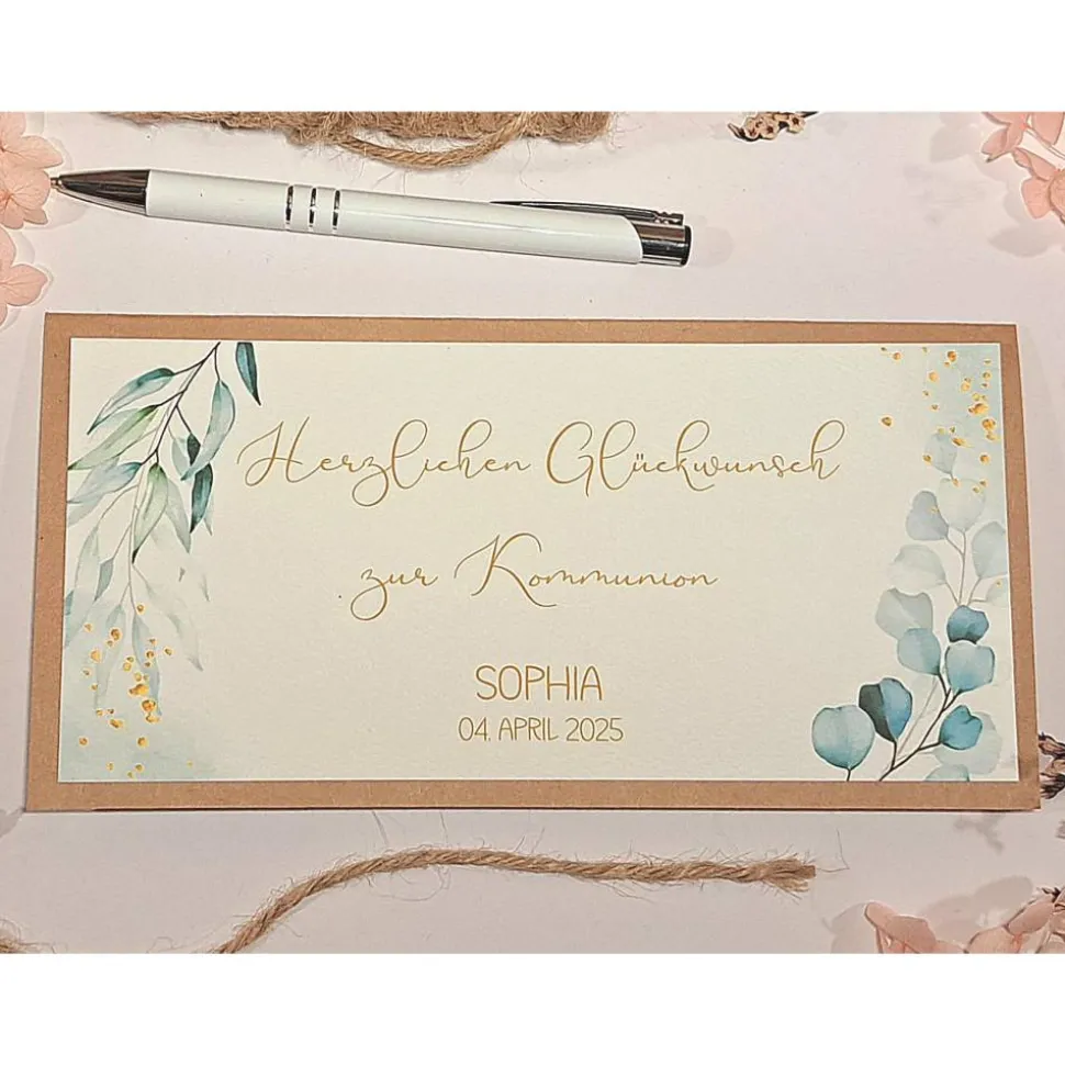 Überreiche zur heiligen Kommunion ein einzigartiges Geschenk: Unsere personalisierte Glückwunschkarte zur Kommunion ist die stilvolle und liebevolle Verpackung für Geldgeschenke, Gutscheine oder Konzertkarten. Gefertigt aus hochwertigem Kraftkarton und verschlossen mit einer rustikalen Juteband-Schleife, beeindruckt die Karte durch ihr edles Aquarell-Blätter-Design.