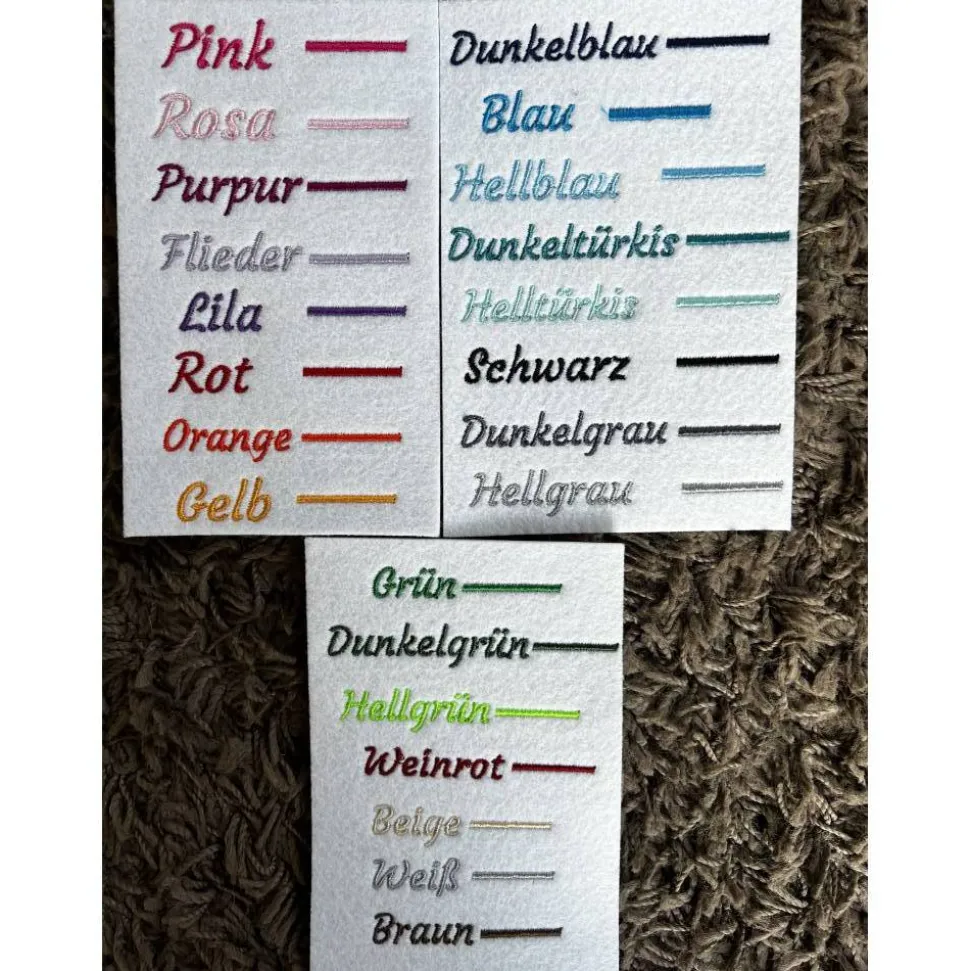 Wählen eine Stickgarnfarbe (für die Texte), zusätzlich können Sie noch eine Schriftart, die Verschlussmöglichkeit (Druckknopf oder Gummiband) und die die Filzfarbe für die Außenseite (Filzinnenseite bekommt die Farbe der gewählten Stickgarnfarbe)