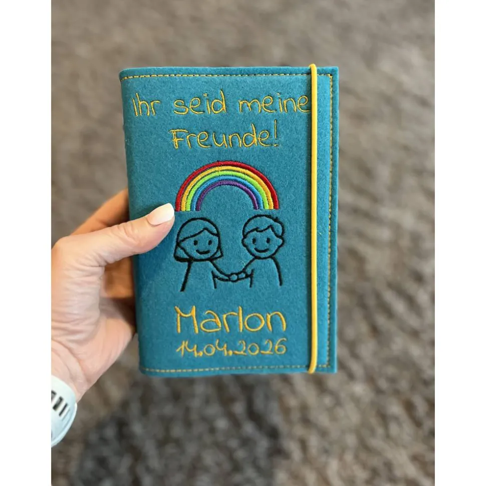 „Ihr seid meine Freunde!“ – das Thema der Kommunion 2026. Dieses Motiv der Gotteslobhülle ist brandneu und wurde von uns selbst entworfen und digitalisiert. Es ist einzigartig und nur bei Taeradesign erhältlich.