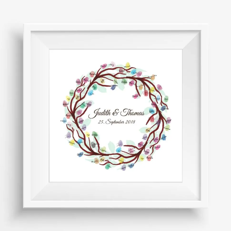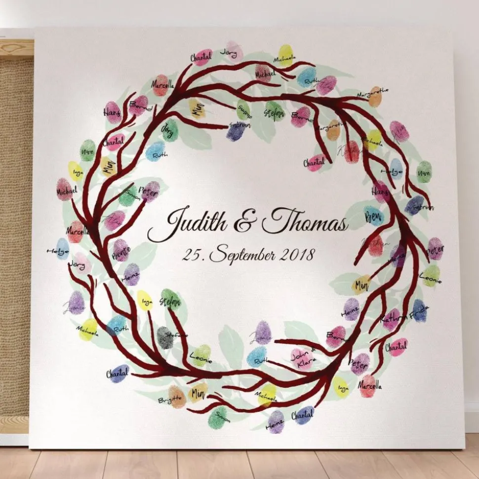 Mach deine Hochzeit unvergesslich! Diese personalisierte Gästebuch-Leinwand ist eine originelle Alternative zum klassischen Gästebuch. Gäste hinterlassen mit bunten Fingerabdrücken und ihrer Unterschrift ein einzigartiges Kunstwerk – ein Symbol für Liebe, Zusammenhalt und unvergessliche Erinnerungen.