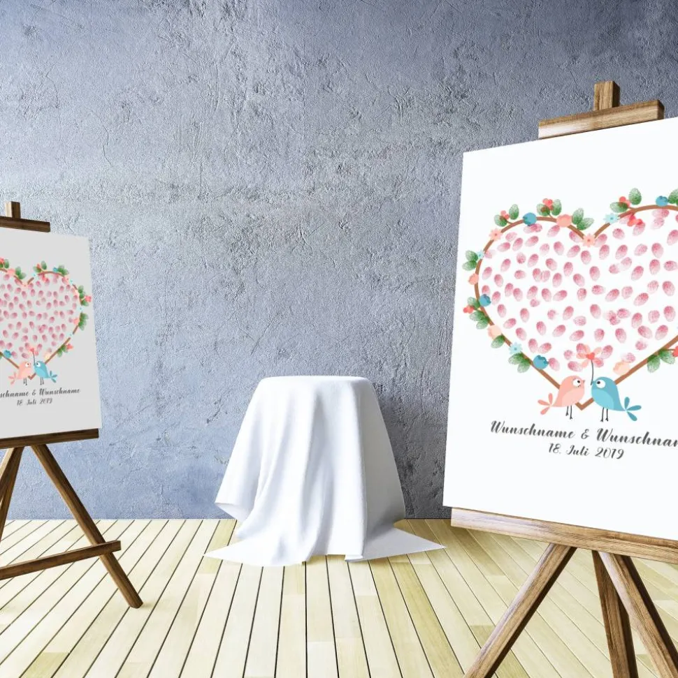 Dieses individuelle Hochzeitsgästebuch auf Leinwand sorgt für bleibende Erinnerungen. Die Gäste verewigen sich mit Fingerabdrücken und Unterschriften – eine kreative Alternative zum klassischen Buch.