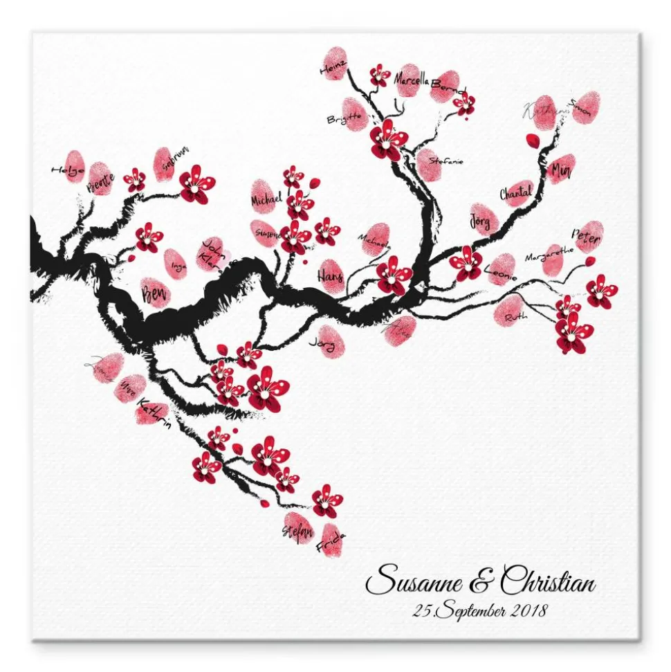 Die Gäste verewigen sich mit ihrem Fingerabdruck (z. B. mit bunten Stempelkissen) direkt auf der Leinwand und können ihren Namen oder eine kleine Botschaft hinzufügen.
