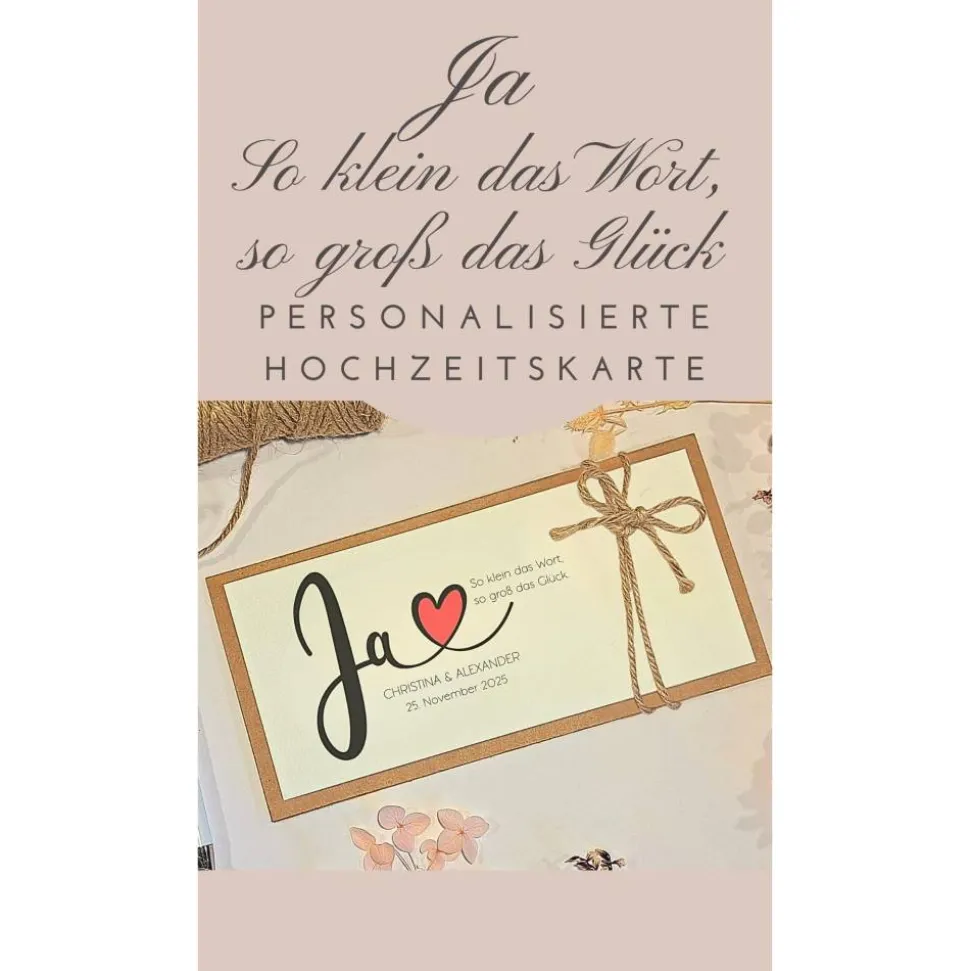Überrasche das Brautpaar mit einer einzigartigen und liebevoll handgemachten Hochzeitskarte! Die elegante personalisierte Hochzeitskarte „Ja“ begeistert durch das große geschwungene Schriftmotiv mit integriertem roten Herz und dem Zitat „So klein das Wort, so groß das Glück“ – ein echter Hingucker für jeden Anlass.