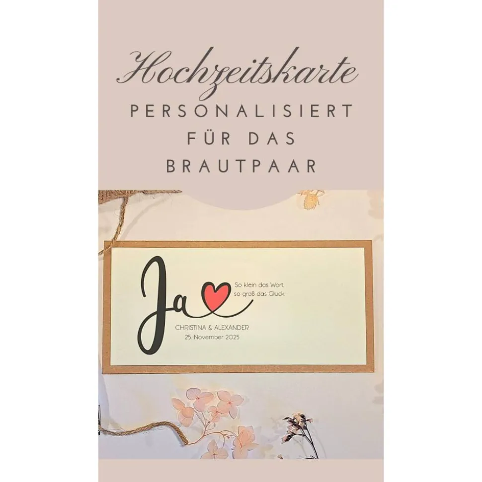 Individuell und emotional: Du kannst die Karte mit den Vornamen des Brautpaares und dem Hochzeitsdatum personalisieren – so wird sie zu einem ganz persönlichen Erinnerungsstück. Im Inneren bietet sie viel Platz für deine Glückwünsche, persönliche Worte oder ein stilvoll verpacktes Geldgeschenk. Auch Gutscheine lassen sich elegant überreichen.