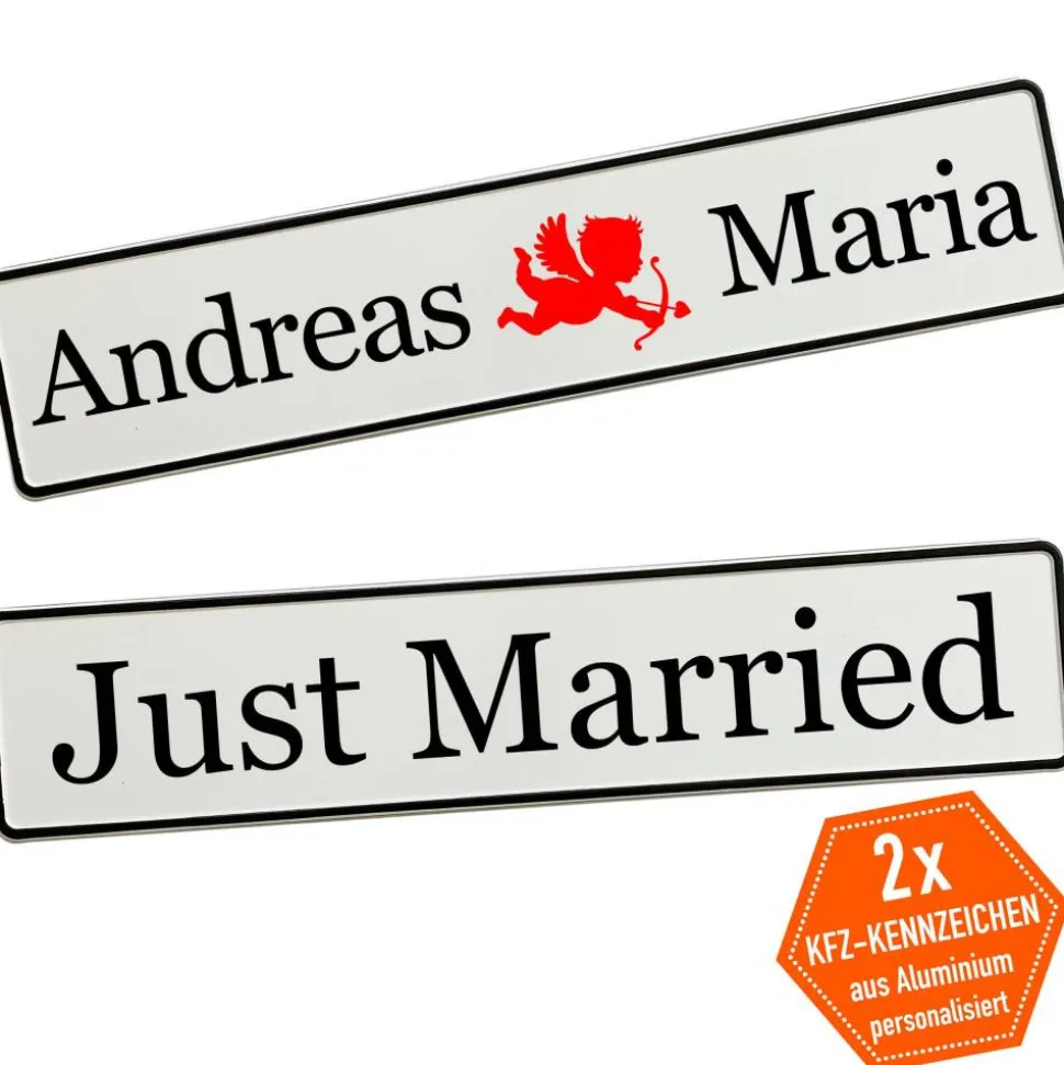 Mach dein Hochzeitsauto einzigartig – mit zwei personalisierten KFZ Kennzeichen aus hochwertigem Aluminium! Diese Schilder sind die perfekte Deko für deine Hochzeit und setzen das Brautpaar stilvoll in Szene. Ob moderne Limousine oder romantischer Oldtimer, die Kennzeichen passen immer und machen deine Fahrt zur Trauung zu etwas ganz Besonderem.