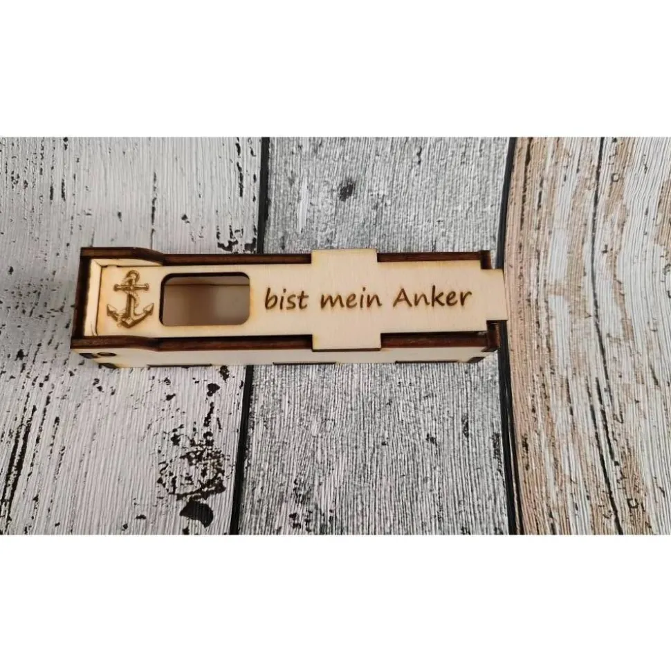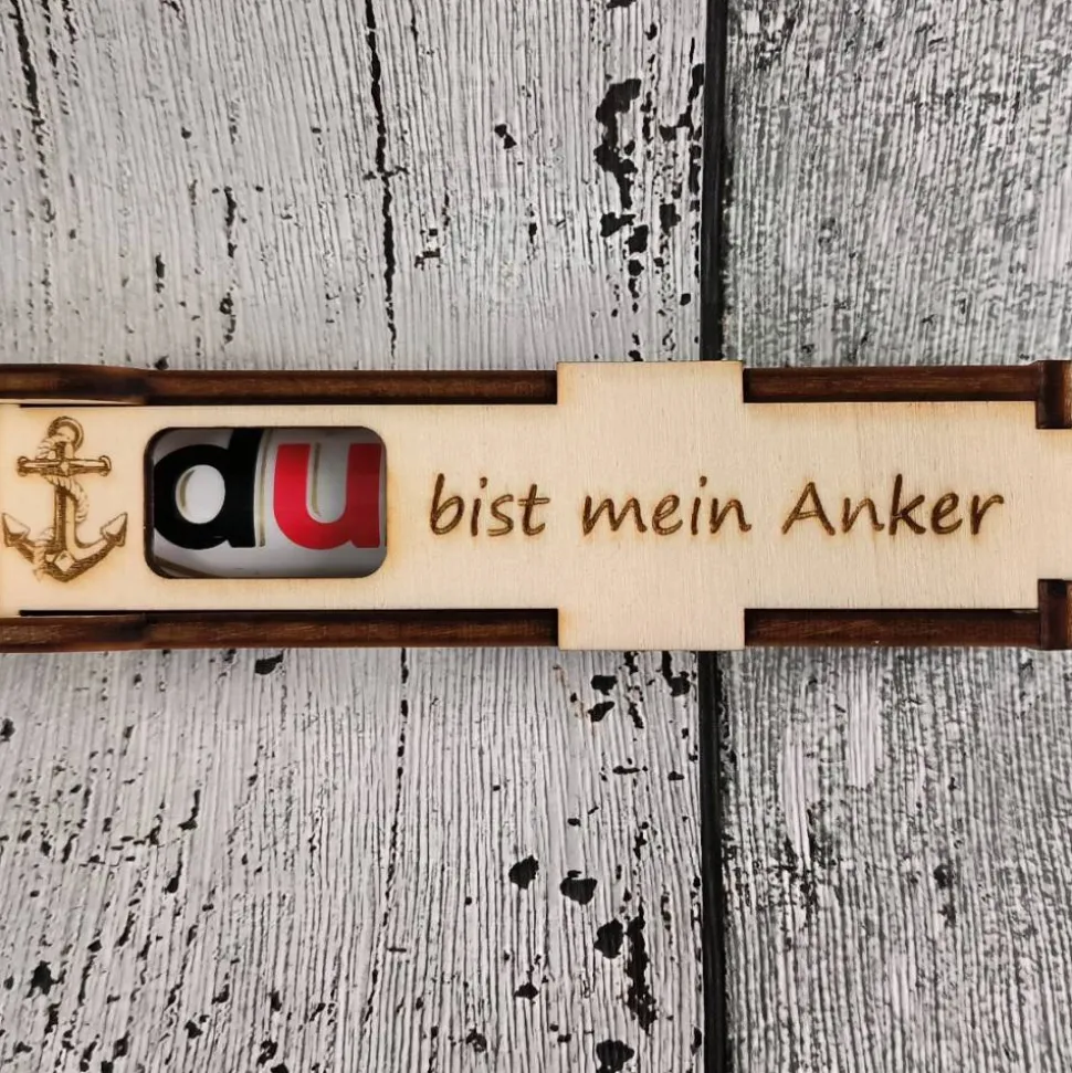 Wähle einen persönlichen Spruch für die Lasergravur auf dem Deckel – ein kleines Motiv wie Herz oder Anker kann ebenfalls neben dem DU gelasert werden. Die Schriftart wird passend zu deinem Wunschtext gewählt, sodass jedes Geschenk individuell und stilvoll wirkt.