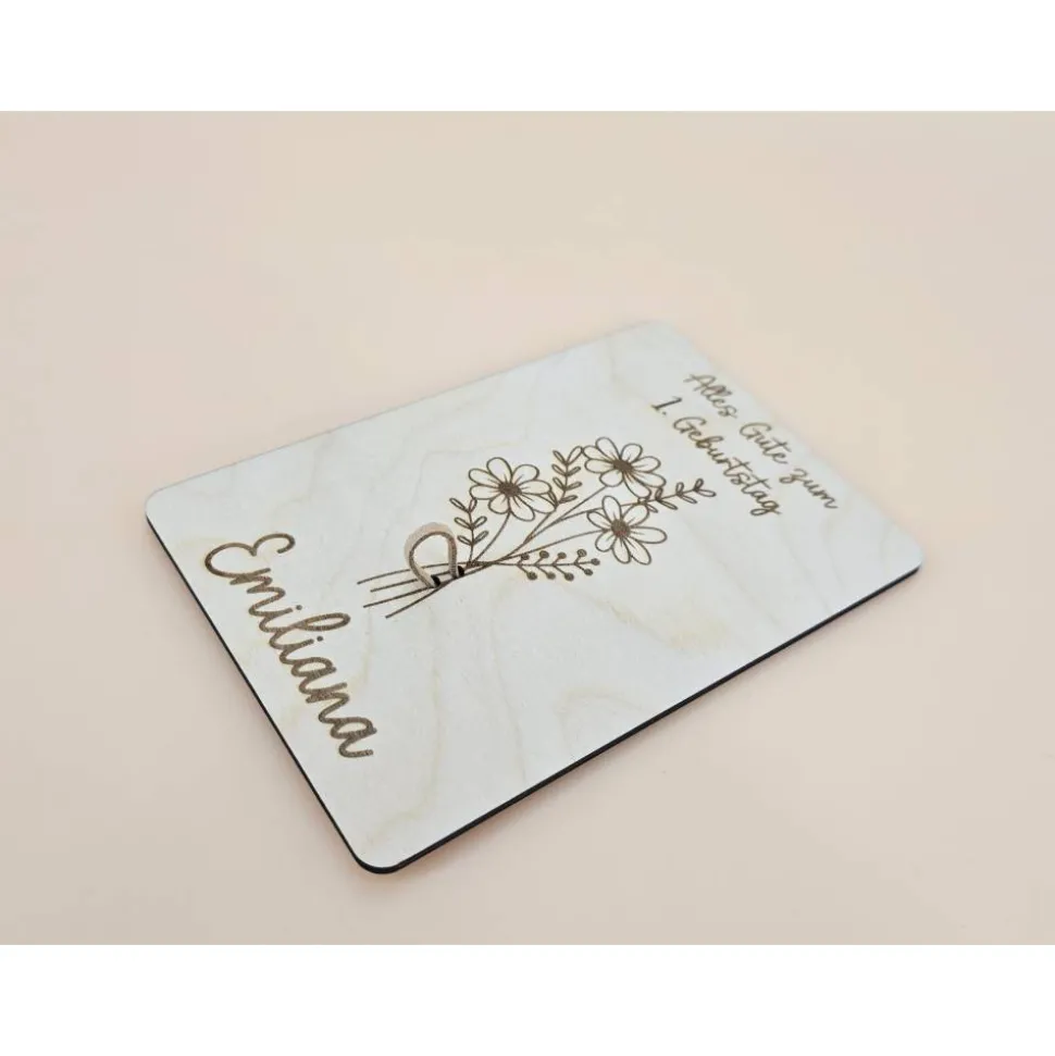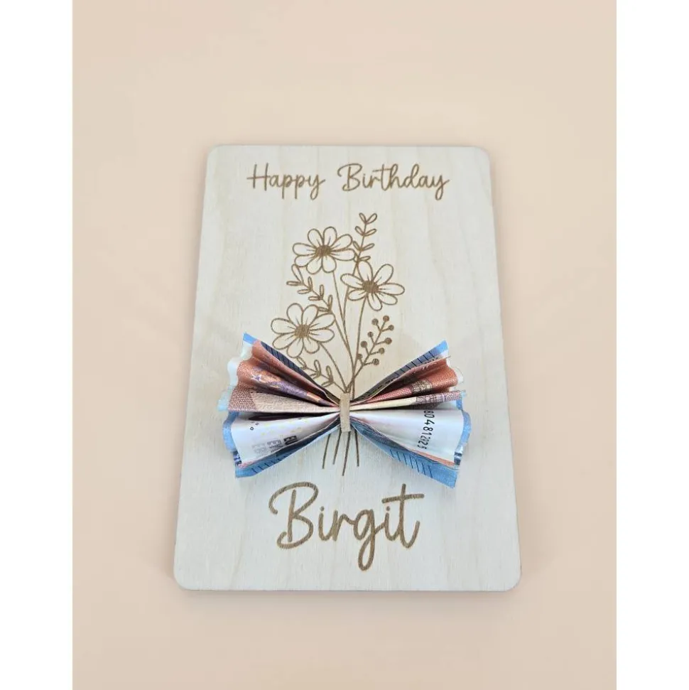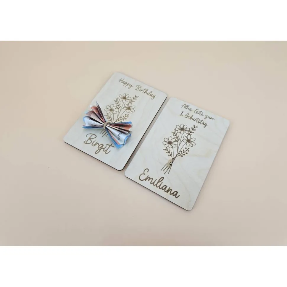 Unsere edlen Karten bestehen aus hochwertigem Holz, das liebevoll graviert und nach Wunsch personalisiert wird. Sie bieten Platz für Geldscheine und sind eine kreative Alternative zu herkömmlichen