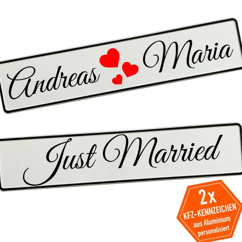 Du gibst einfach die gewünschten Namen an und wählst die passende Schriftart – wir fertigen dein persönliches Hochzeitskennzeichen mit viel Liebe zum Detail. Schon in kurzer Zeit hältst du deine individuelle Autodeko in den Händen.
