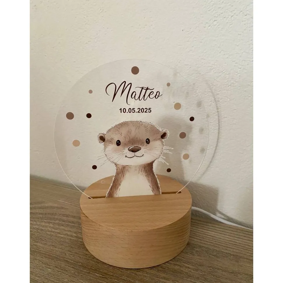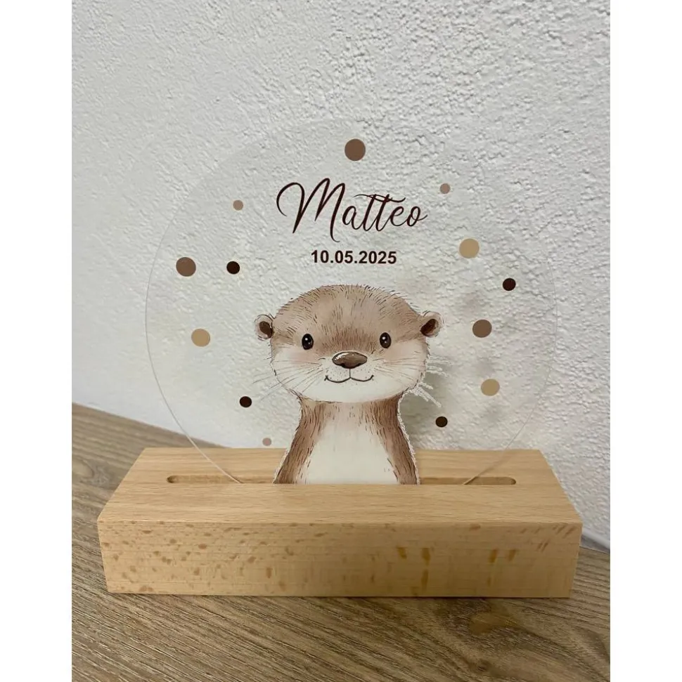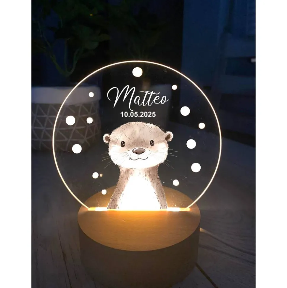 Personalisierbares LED-Nachtlicht mit Waldtieren – mit Holzsockel & AcrylglasBringe Magie ins Kinderzimmer! Unser liebevoll gestaltetes LED-Nachtlicht ist nicht nur ein stilvoller Hingucker, sondern auch ein beruhigender Begleiter für die Nacht. Ideal als Geschenk zur Geburt, Taufe oder zum Geburtstag!✨ Produktdetails:•Individuell personalisierbar mit dem Namen des Kindes und auf Wunsch auch mit dem Geburtsdatum•Zwei edle Sockelvarianten: rund oder rechteckig, aus hochwertigem Holz gefertigt•Sanftes LED-Licht, betrieben über ein USB-Kabel mit praktischem An-/Ausschalter•Motiv auf Acrylglas: bezaubernde Waldszene mit Otter, Reh, Vogel, Eichhörnchen & Bär•Größe: runder Sockel: ca 10 cm Durchmesser, rechteckiger Sockel: ca 15 x 4,5 cm Höhe: ca 17 cmOb als Nachtlicht auf dem Nachttisch, sanfter Lichtakzent im Regal oder dekoratives Element im Babyzimmer – dieses Licht zaubert eine warme Atmosphäre und bringt die Natur auf ganz besondere Weise ins Haus. Warum du dieses Nachtlicht lieben wirst:•Handgemacht mit Liebe zum Detail•Perfekt als persönliches Geschenk•Stilvolle Kombination aus Holz, Licht & Tiermotiven•Langlebig & energiesparend dank LED-Technik • Bruchfestes AcrylglasPersonalisierung mit GREENGUARD Gold Tinte: Für die Personalisierung nutzen wir keine Folie oder Aufkleber, sondern unsere Tiermotive werden mit umweltfreundlicher und sicherer Tinte auf das Acrylglas gebracht. Diese Tinte erfüllt strenge Umweltstandards und ist ideal für Kinderspielzeug geeignet.Beachte:Das LED-Nachtlicht wird ohne USB-Netzstecker geliefert.Beim Drucken kommt es vor, dass kleine Staubpartikel auf dem Acrylglas haften, das lässt sich leider nicht vermeiden und stellt keinen Reklamationsgrund dar. Personalisierte Artikel sind von der Rückgabe ausgeschlossen.Wird kein Farbwunsch geäußert, werden die Schrift und die Pünktchen IMMER in weiß bedruckt.Wird keine Sockelform angegeben, wird immer rechteckig geliefert.Altersempfehlung: Dekoobjekt. Dieses Produkt ist kein Spielzeug. Für Kinder ab 0 Jahren geeignet.· Warnhinweise: Das Nachtlicht sollte nur an eine geeignete Stromquelle (z. B. USB-Anschluss) angeschlossen werden. Kontrolliere das Kabel und den Anschluss regelmäßig auf Schäden. Verwende das Produkt nicht, wenn sichtbare Schäden vorhanden sind. Verwende das Produkt ausschließlich gemäß den Anweisungen. Nicht in feuchten oder nassen Umgebungen verwenden, um Schäden am Elektronikbauteil zu vermeiden.· Unabhängig getestet: Das Produkt wurde auf Schadstoffe geprüft und ist CE-zertifiziert.· Material: Acryl, Buchenholz· Pflegehinweise: Mit einem weichen, trockenen oder leicht feuchten Tuch reinigen. Nicht mit aggressiven Reinigungsmitteln behandeln.· Hinweis: Für den Innenbereich geeignet. Holz ist ein Naturprodukt, leichte Abweichungen in Farbe und Struktur sind möglich.
