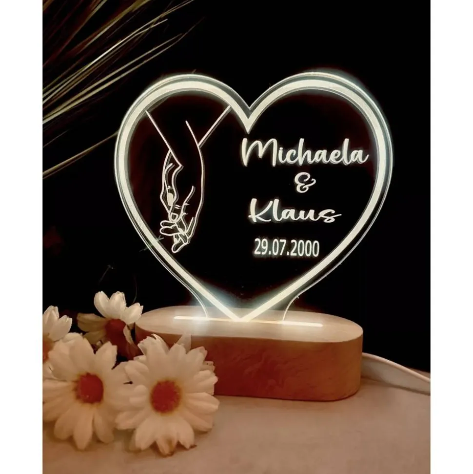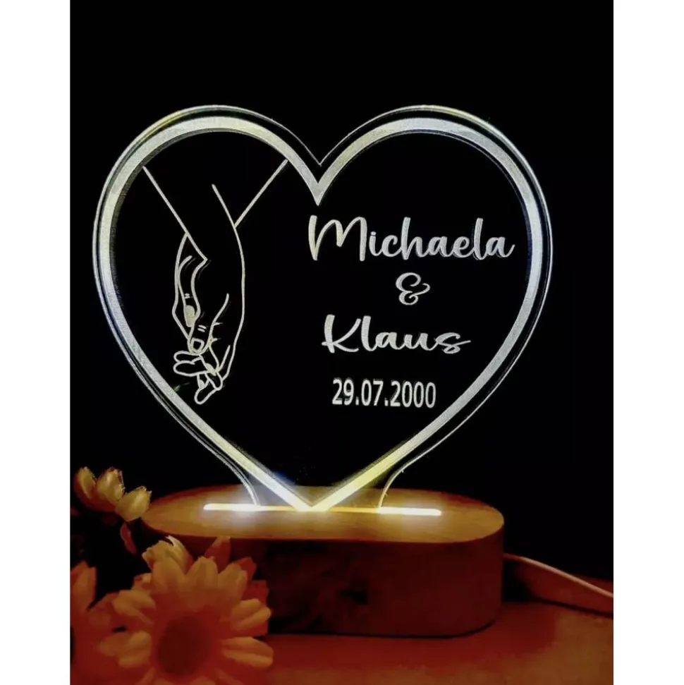 Die Lampe wird mit einem Netzteil betrieben und kann über USB mit Strom versorgt werden. Ein Sensor sorgt für eine automatische Steuerung des Lichts. Mit einer Höhe von 17 cm und einer Breite von 16 cm ist die Herzlampe sowohl für kleine als auch große Räume geeignet. Personalisieren Sie die Lampe mit Ihrem eigenen Text für eine individuelle Note