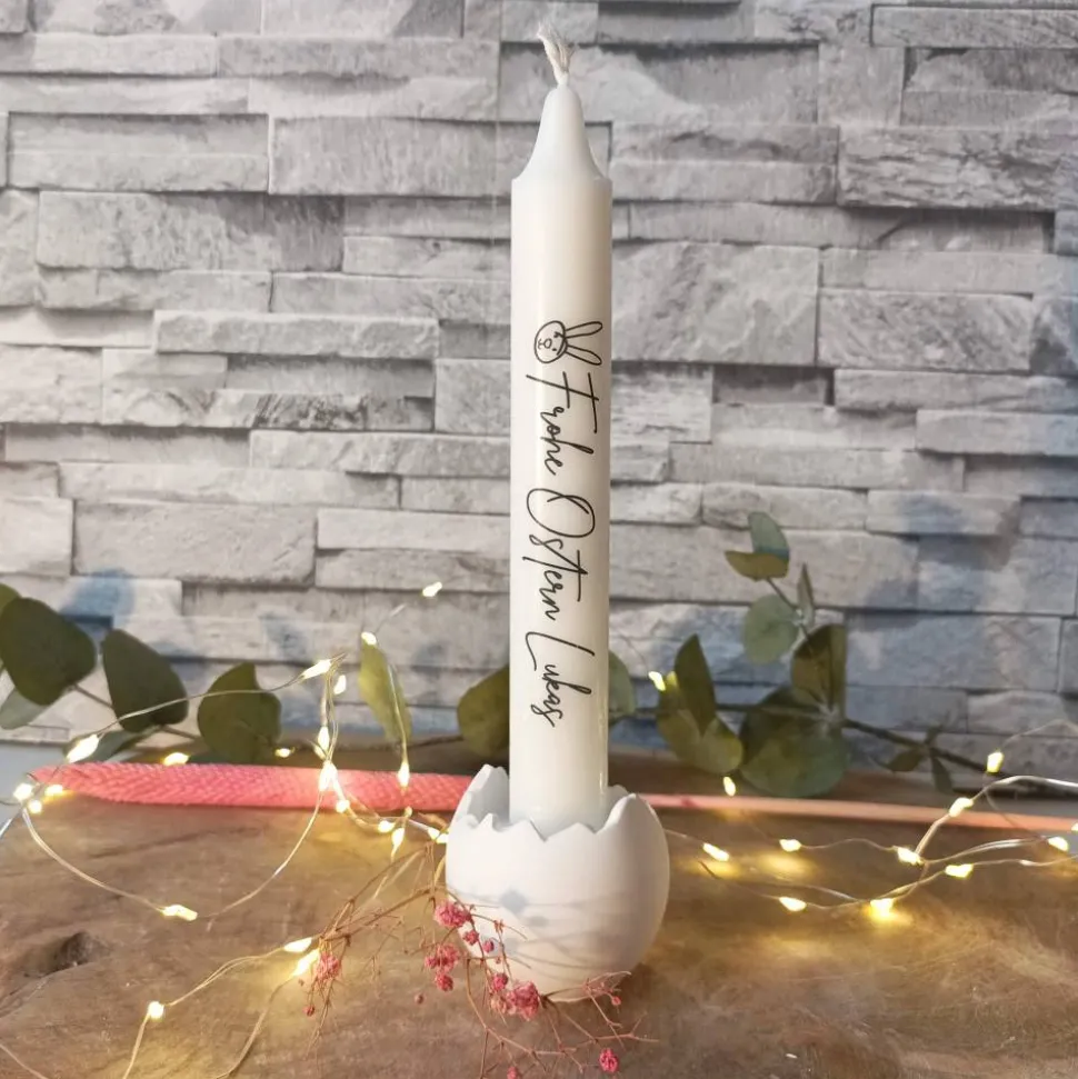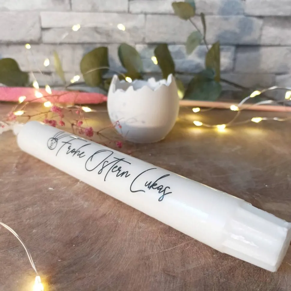 Feiere Ostern und den Frühling mit einzigartigen, personalisierten Osterkerzen. Jede Kerze wird mit Liebe handgefertigt und mit hochwertiger Wasserschiebefolie gestaltet. So entsteht eine Osterkerze, die nicht nur Licht spendet, sondern auch Herzen berührt und Emotionen weckt.