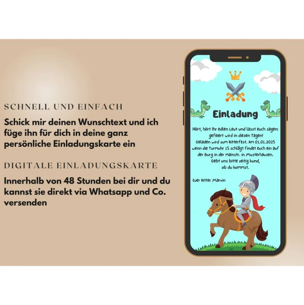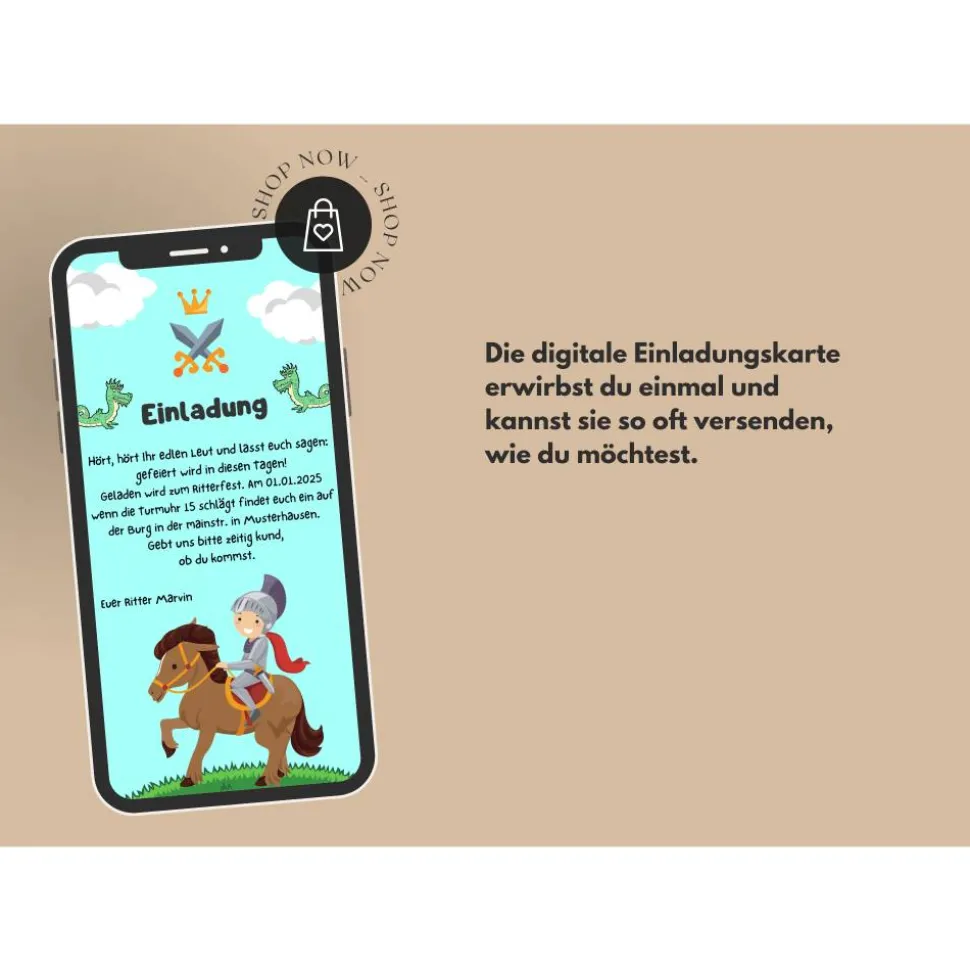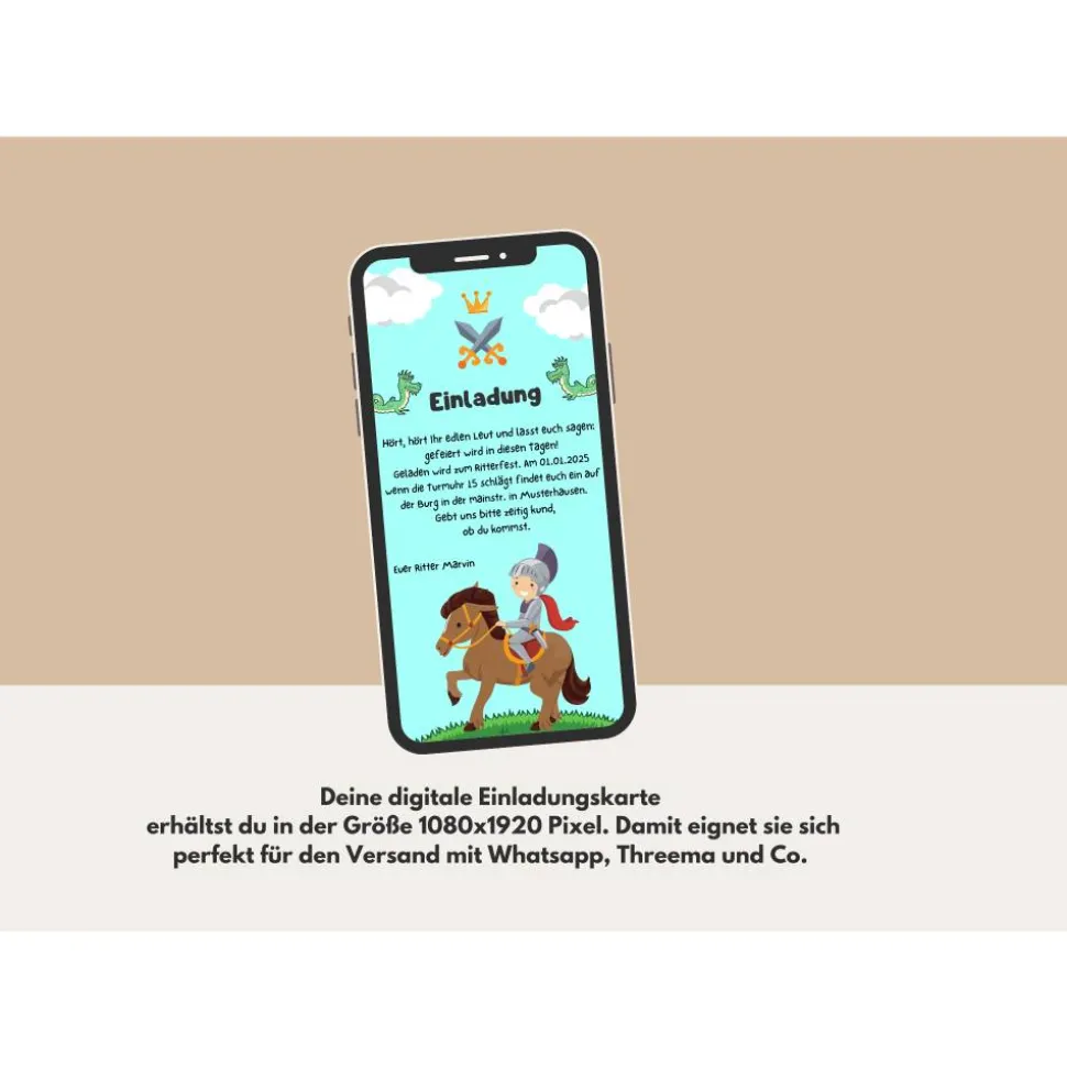 Mit dieser digitalen Einladung im Ritter-Design wird jedes Geburtstagskind zum Helden! Perfekt für Eltern, die eine originelle und unkomplizierte Einladung suchen.
