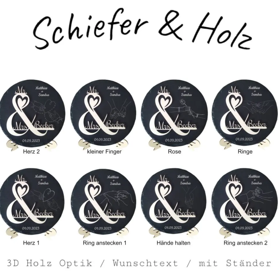Unsere 20 cm große Schiefertafel sticht durch ihre filigrane 3D-Holzstruktur hervor. Das Motiv „Mr. & Mrs.“ wird aus echtem Holz präzise gelasert. Das Beste: Sie können den Nachnamen, die Vornamen und das Hochzeitsdatum individuell gestalten lassen! So wird die Tafel zu einem Unikat, das nicht nur gut aussieht, sondern auch emotional berührt.