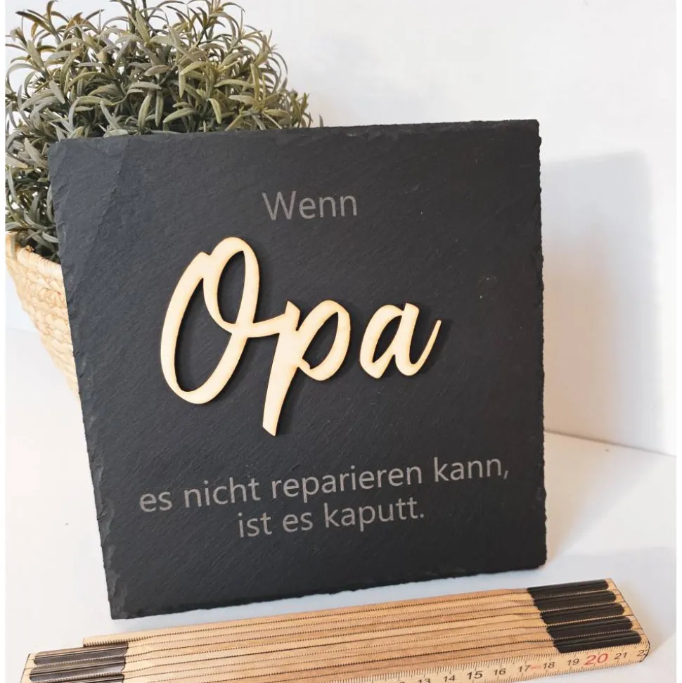 Verschenke ein Unikat voller Liebe: Unsere personalisierte Schieferplatte (20×20 cm) ist das perfekte Geschenk für Opa, Papa, Mama oder Oma – ideal zu Weihnachten, Geburtstag, Muttertag oder Vatertag. Die edle Naturschieferplatte wird mit deinem Wunschtext liebevoll graviert und auf Wunsch mit Holzschriftzügen veredelt.