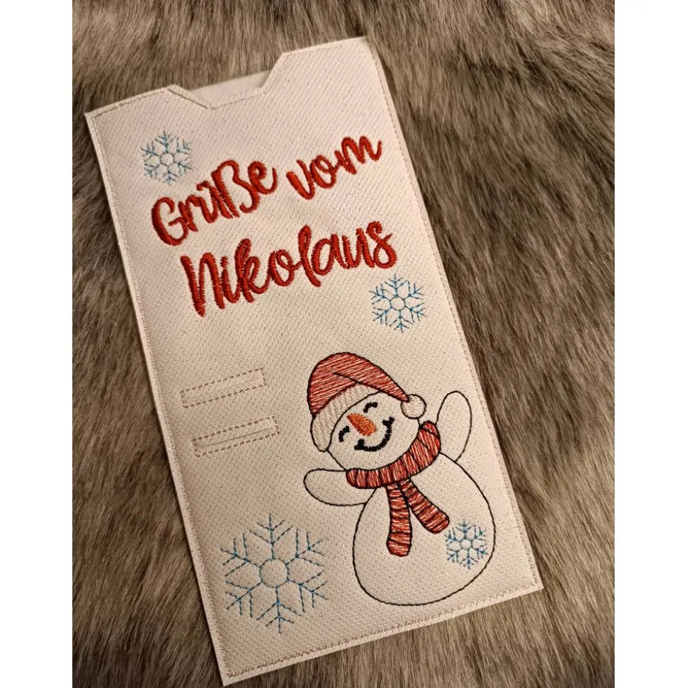 Mit der Schokohülle Schneemann mit Geldschlitz hast du die perfekte Geschenkverpackung für eine 100g Tafel Schokolade (Maße: ca. 16cm x 8cm x 1,5cm) und Geldscheine. Die Hülle besteht aus hochwertigem Kunstleder in der Farbe weiß glitzer und misst ca. 10cm x 18cm.