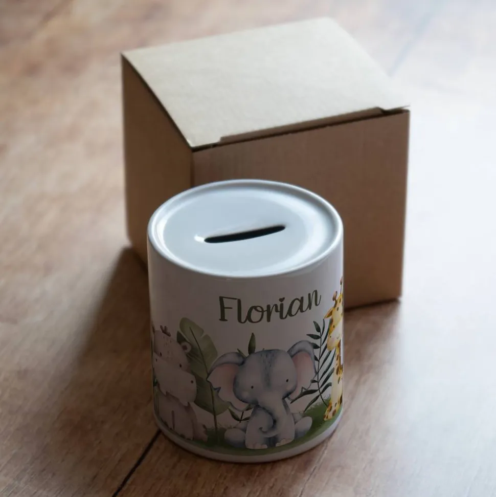 Sparbüchse mit Einwurfschlitz und farbenfrohen Tier-Motiv im trendigen Watercolor-Stil. Ein echter Hingucker für Kinder und eine kreative Idee für Geldgeschenke.