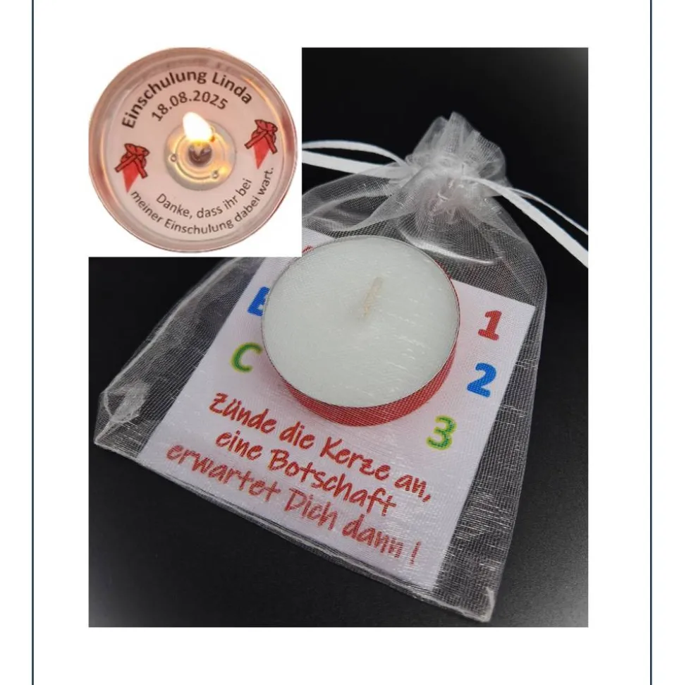 Individuell gestaltet: Dein Teelicht wird mit dem Namen des Kindes, dem Einschulungsdatum und einer persönlichen Dankesbotschaft versehen. Im Inneren verbirgt sich ein Papiereinleger mit deiner individuellen Nachricht, die beim Anzünden sichtbar wird.