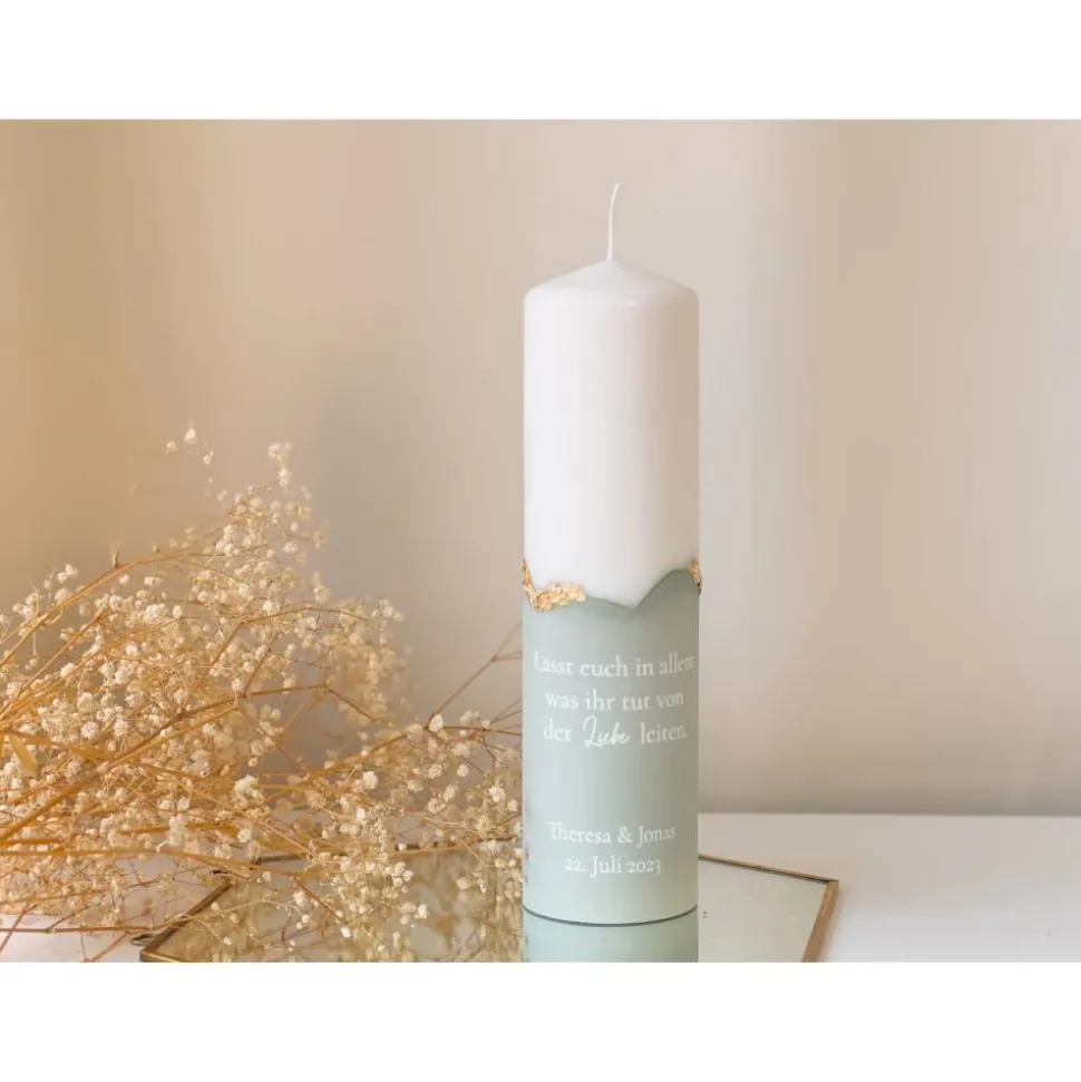 Unsere Traukerzen sind handgefertigt und werden sorgfältig personalisiert, um ein einzigartiges Andenken an deine Hochzeit zu schaffen.
