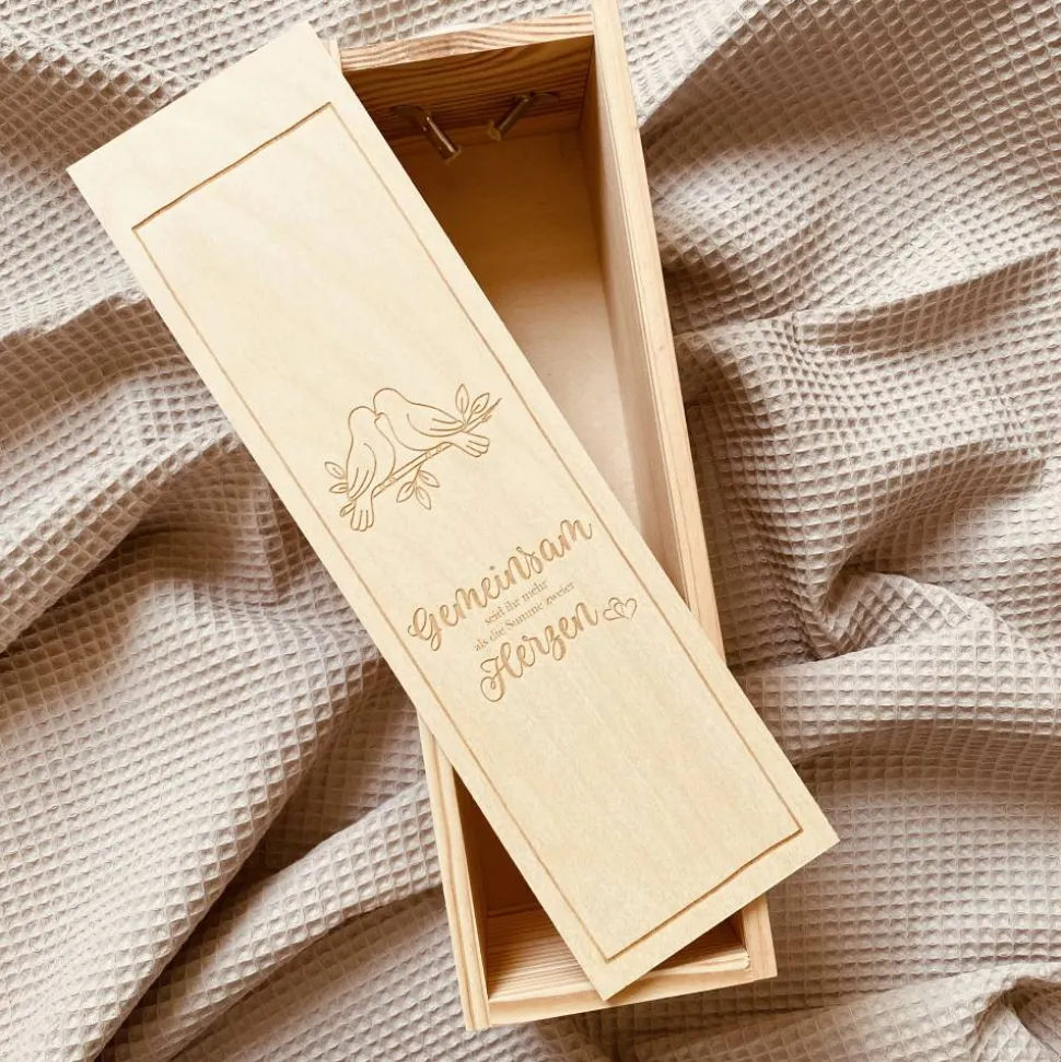 *Die Weinflasche und Dekoration sind nicht mit in der Lieferung enthalten. Es wird nur die gravierte Weinkiste geliefert.*