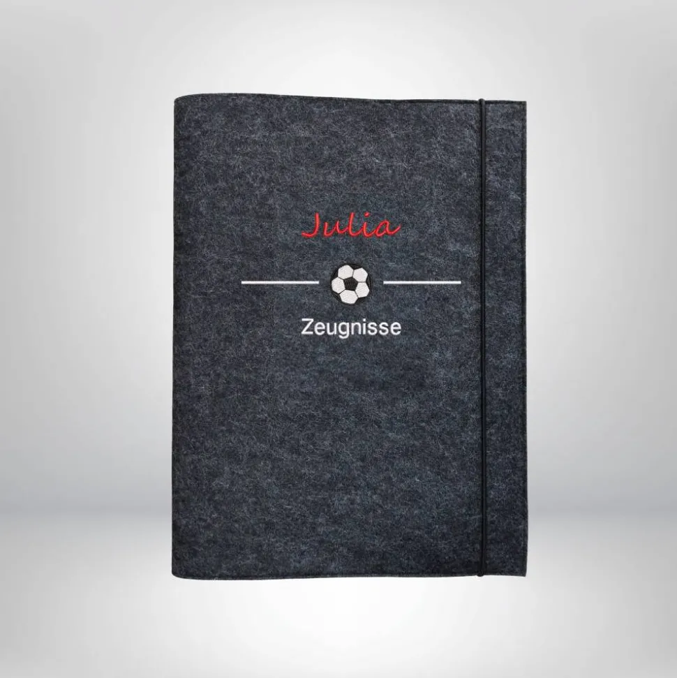 Entdecke die personalisierte Zeugnismappe für Fußballfans – handgefertigt am Bodensee aus hochwertigem Designfilz (100% Polyester, Farbe: anthrazit meliert). Dieses exklusive Sichtbuch von Leitz bietet Platz für bis zu 40 DIN A4-Einlagen dank der 20 integrierten Klarsichthüllen aus schwarzem Polypropylen.