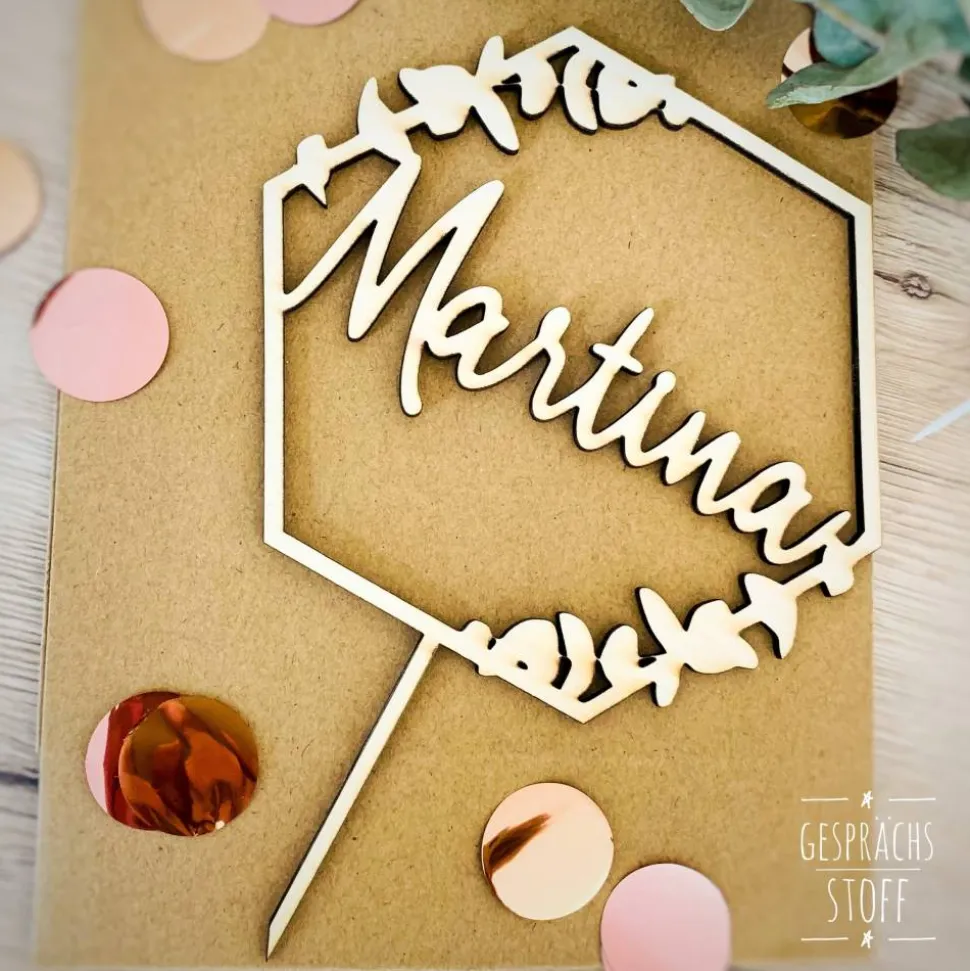 Der Cake Topper ist auf Wunsch entweder mit einem Namen – beispielsweise für einen Geburtstags-, Einschulungs- oder Kommunionkuchen – zu erwerben oder mit zwei Namen für eine Hochzeitstorte zur grünen, silbernen oder goldenen Hochzeit.
