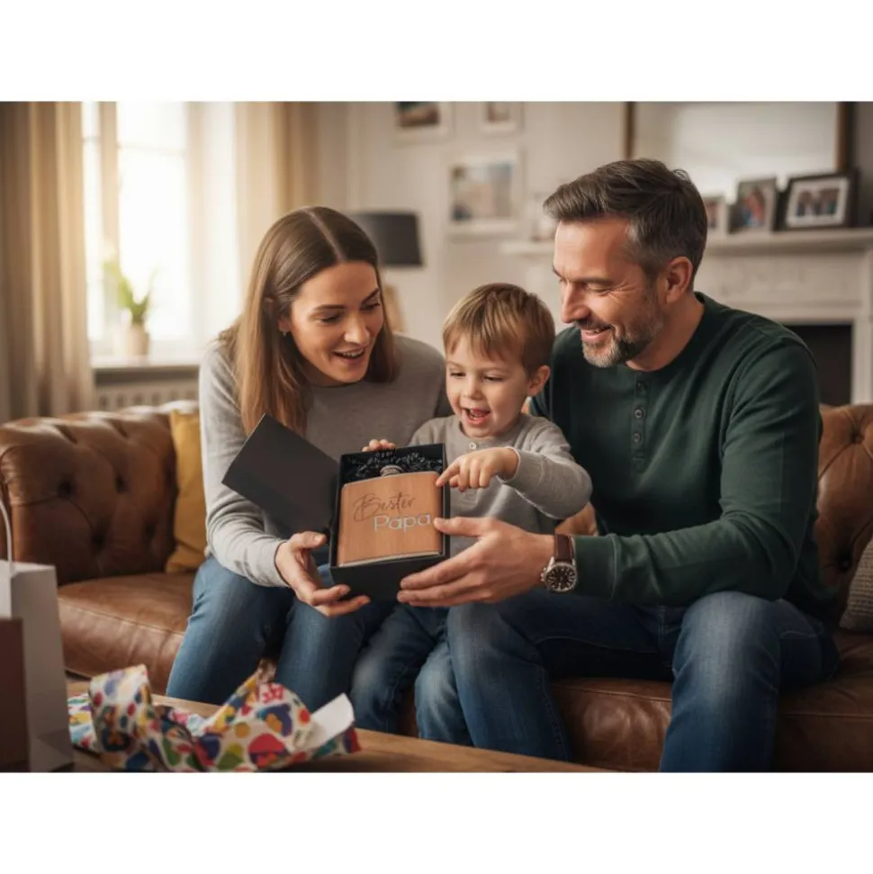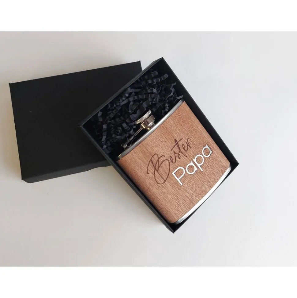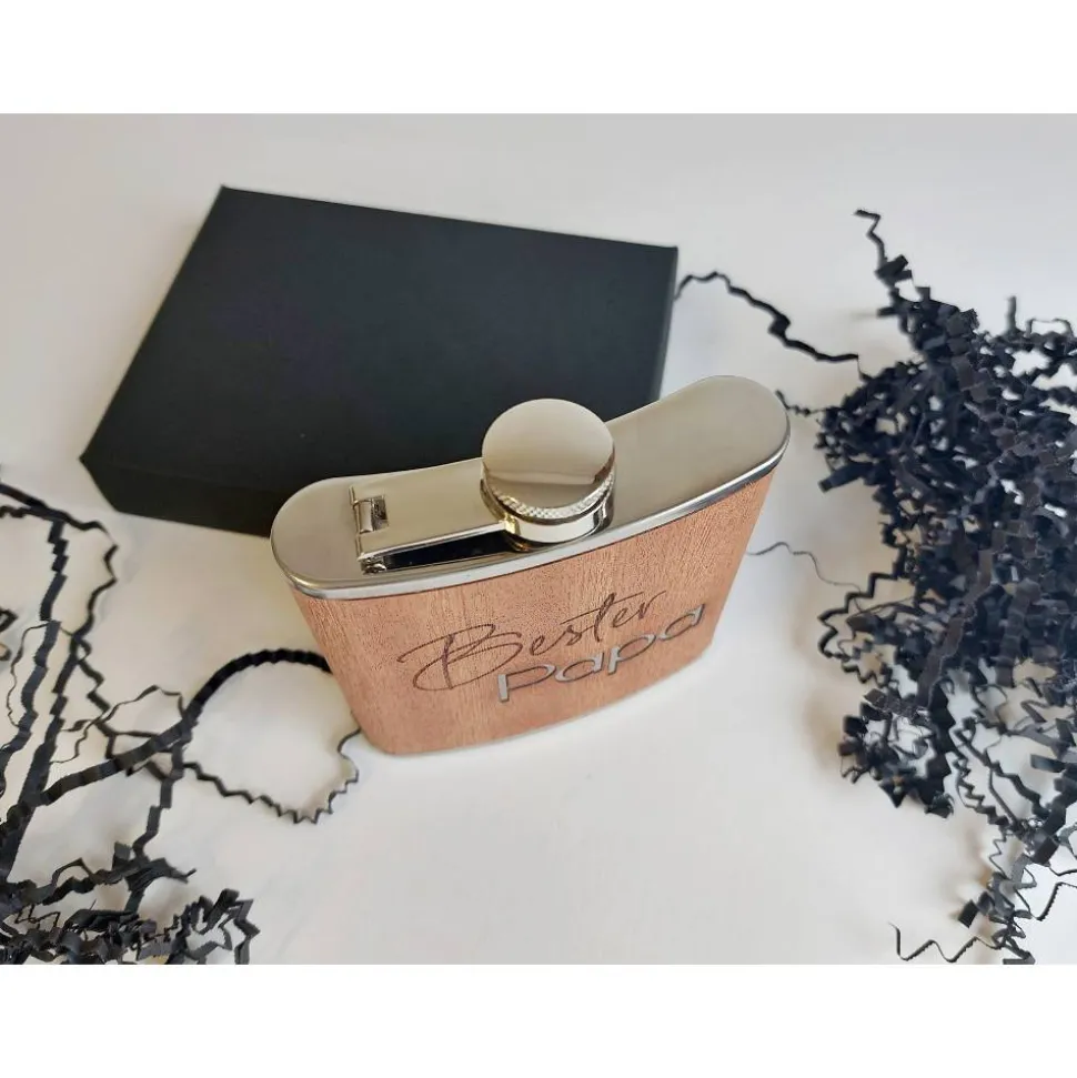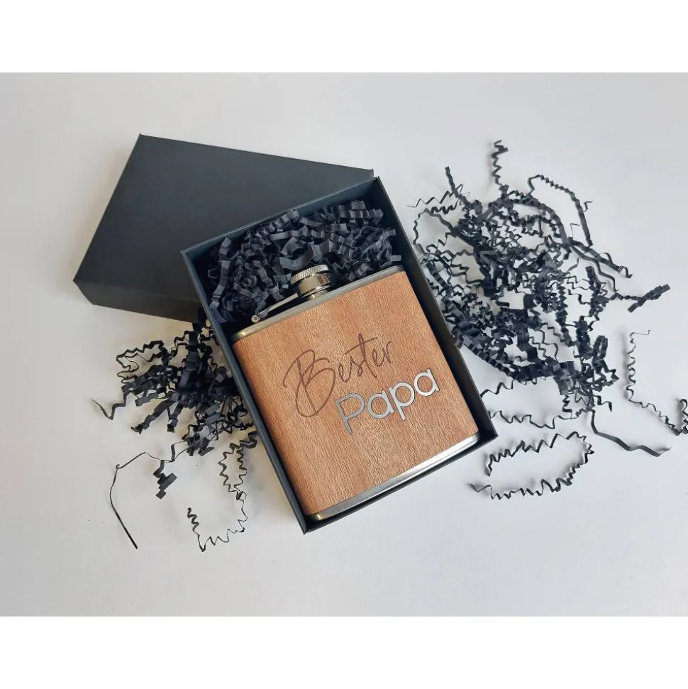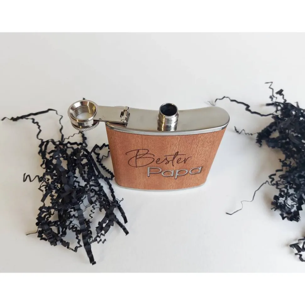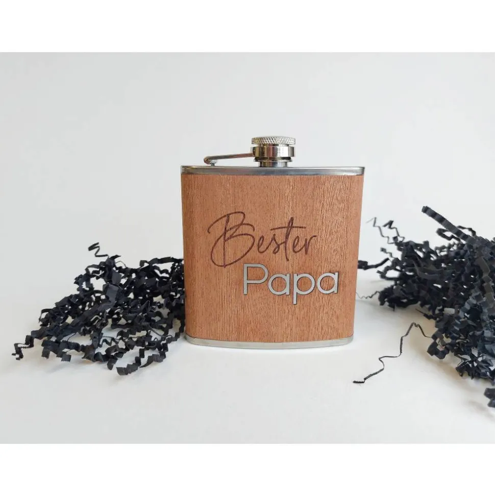 Verschenke einen einzigartigen Flachmann „Bester Papa“ – ein edles und persönliches Geschenk für besondere Anlässe. Der Flachmann besteht aus hochwertigem Edelstahl und ist mit einer eleganten Holz-Oberfläche veredelt. Durch die individuelle Gravur mit Wunschwort, wie zum Beispiel „Papa“, „Mama“ oder „Opa“, erhältst du ein Unikat, das garantiert Eindruck macht.