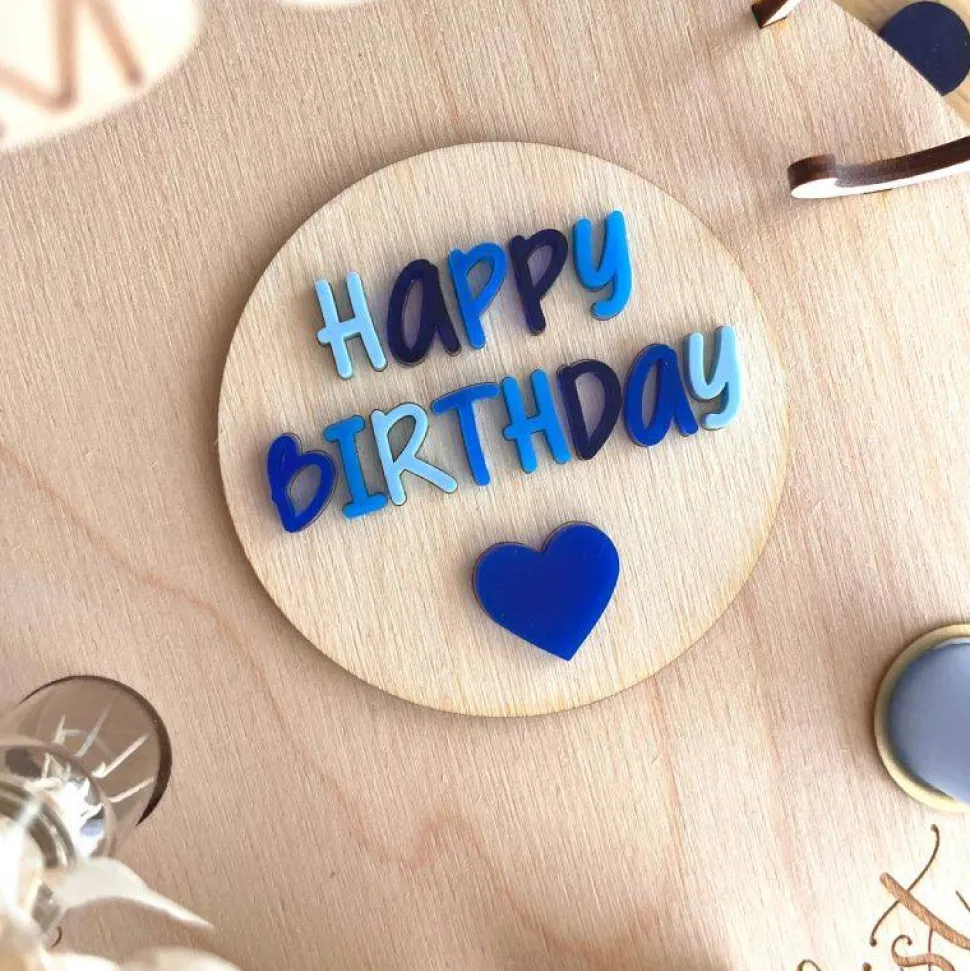 – ein blaues Holzschild mit „happy birthday“