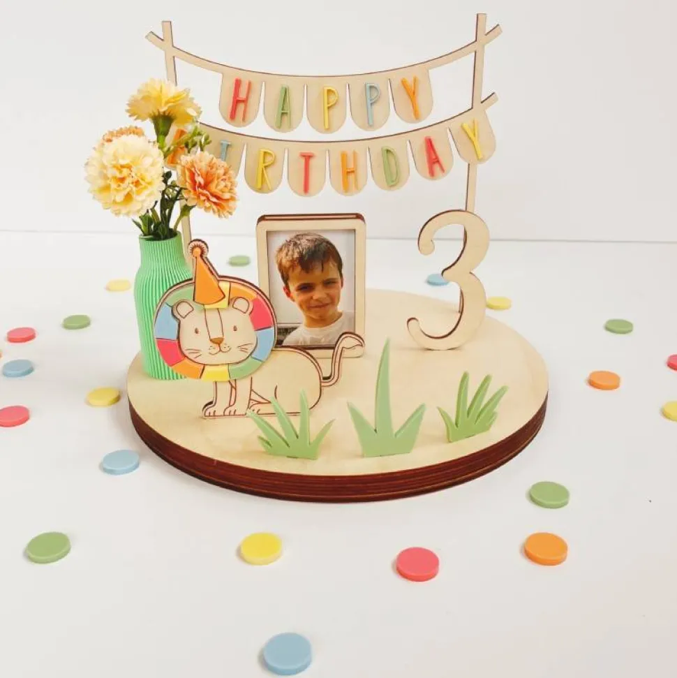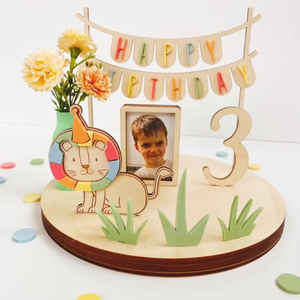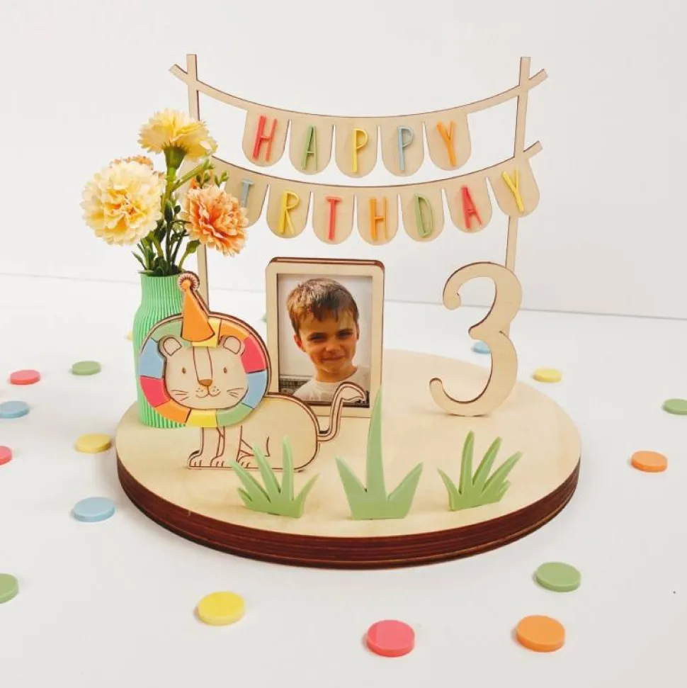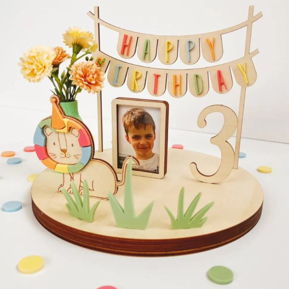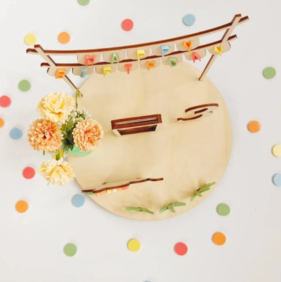 – eine Wimpelkette mit „Happy Birthday“ aus buntem Acryl