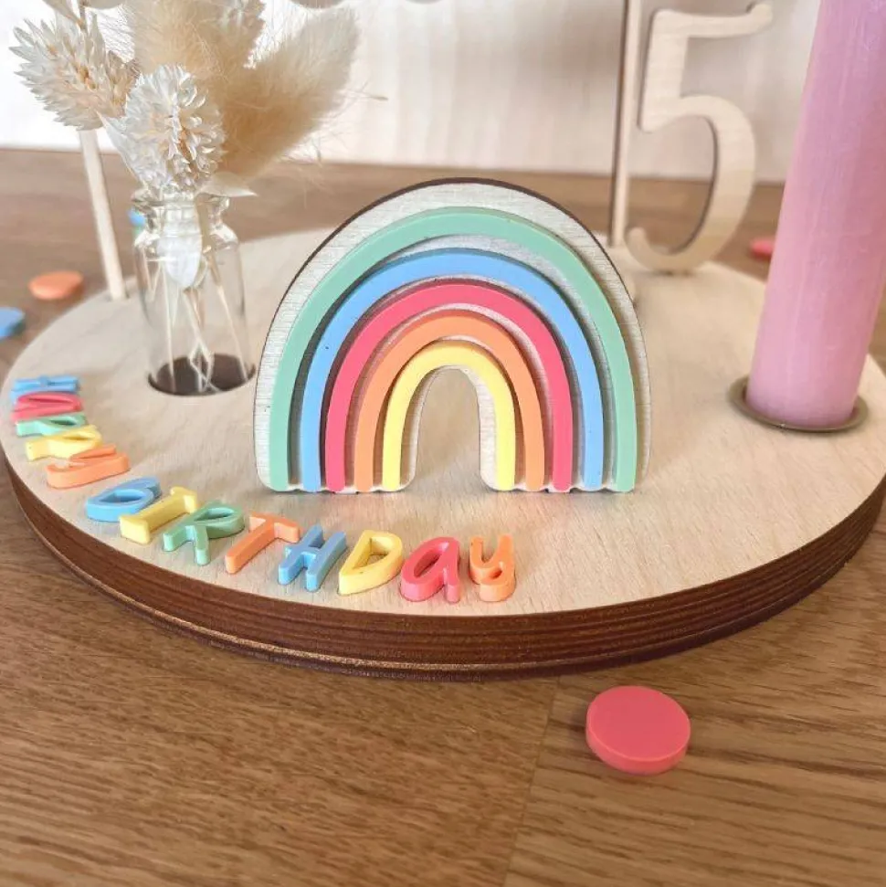 – der Geburtstags-Basisteller mit der Aufschrift „Happy Birthday“ aus buntem Acrylglas