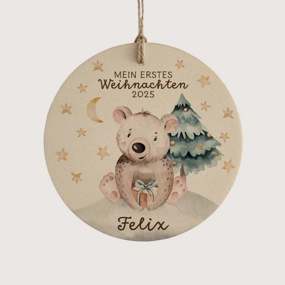 Personalisierter weihnachtlicher Anhänger aus Holz mit einem süßen Bären für das erste Weihnachten mit den Kleinsten.